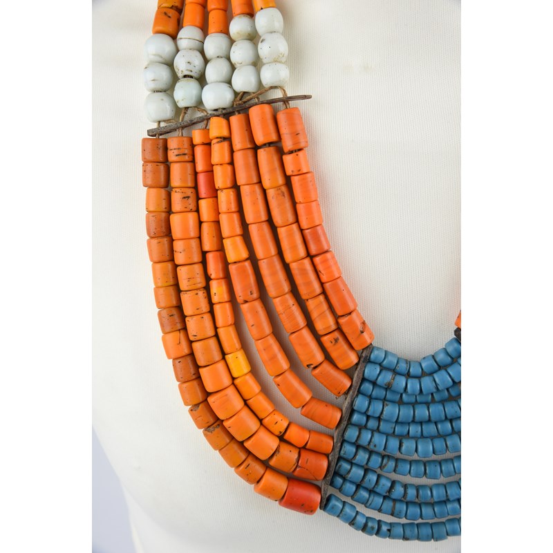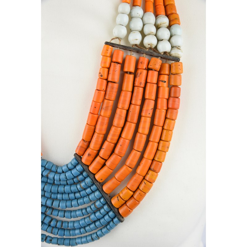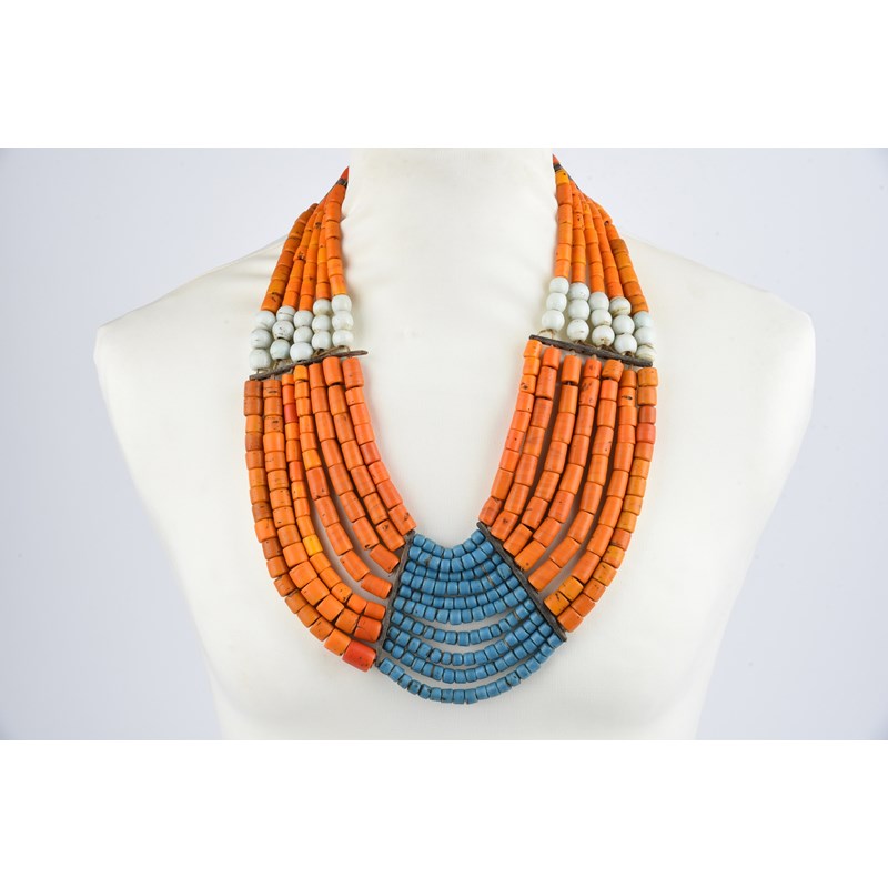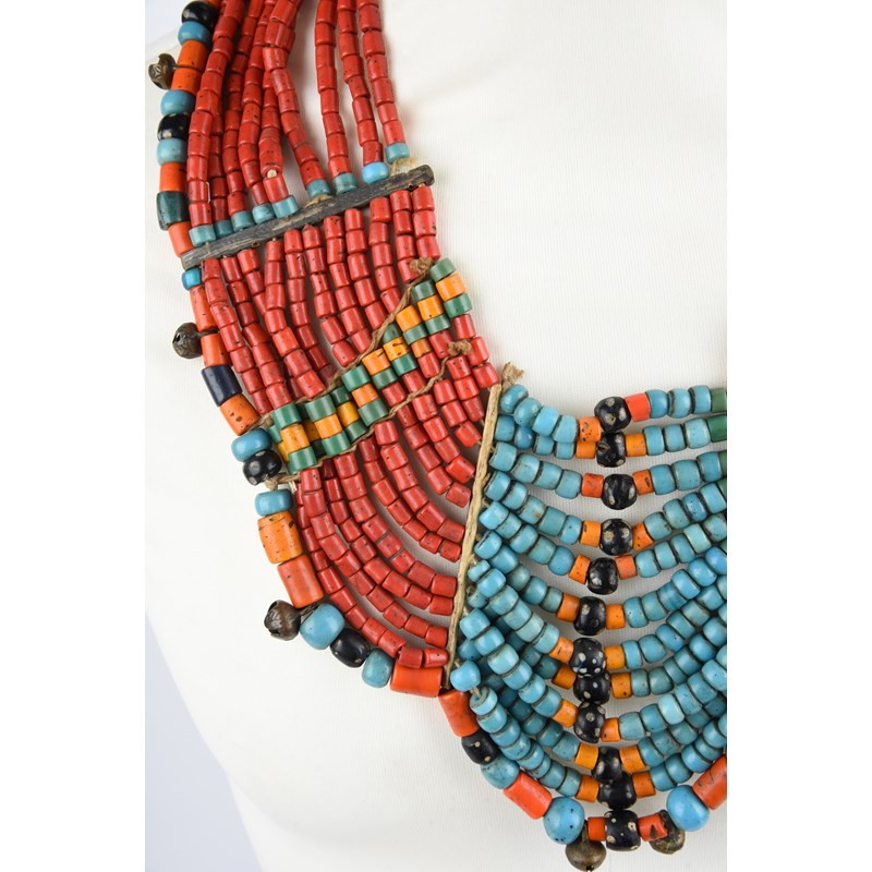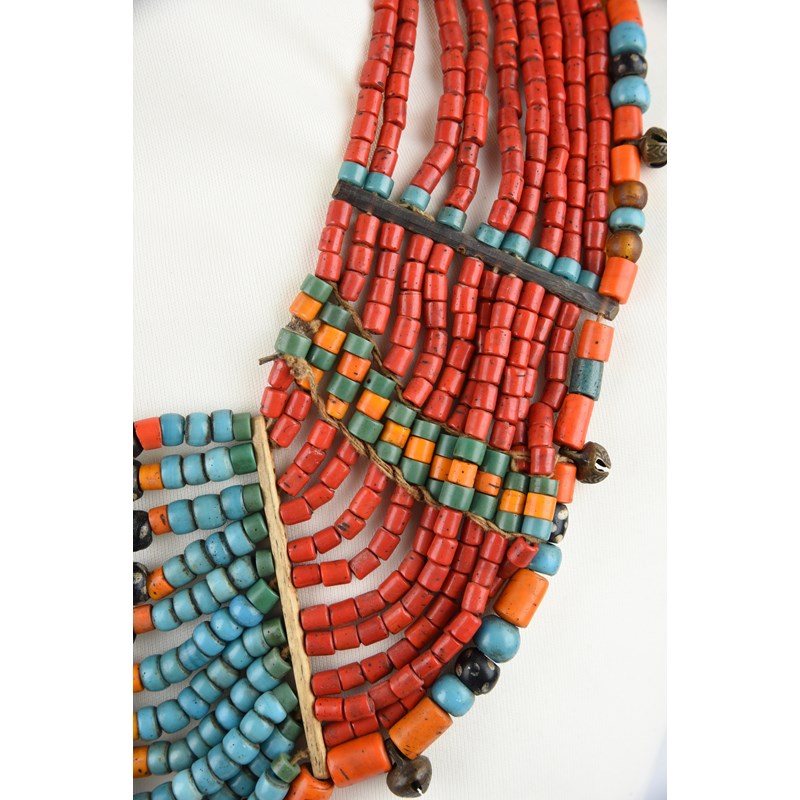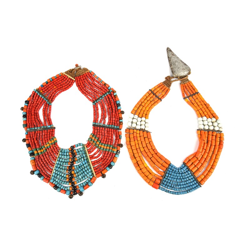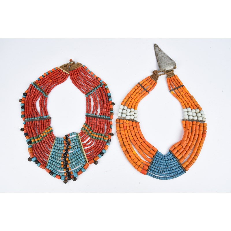 coloured glass beads and bone spacers, one with an aluminium chank shell shape clasp and the other with a square aluminium clasp and with bell pendants,