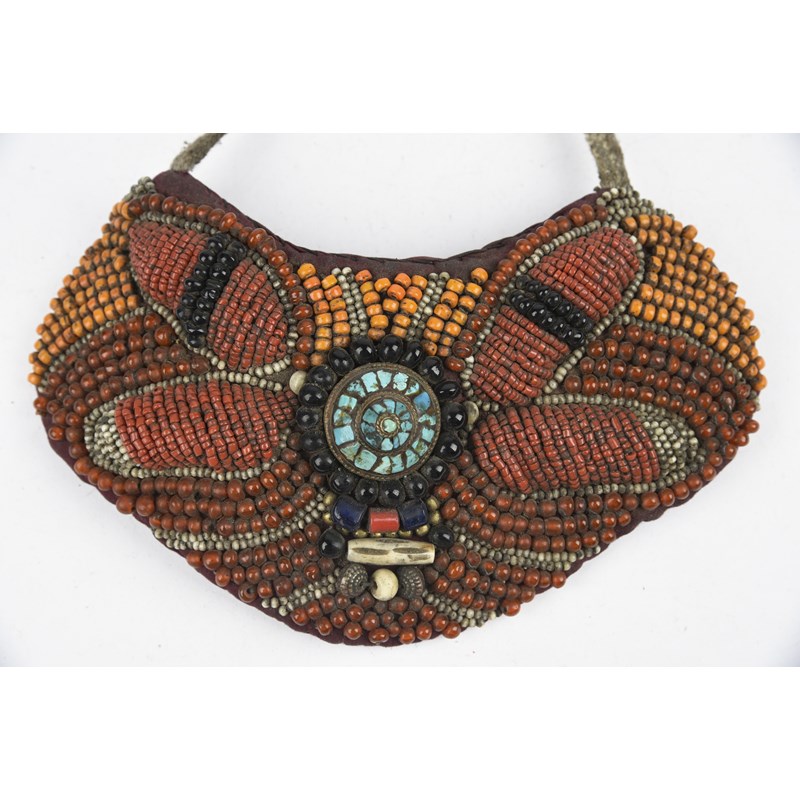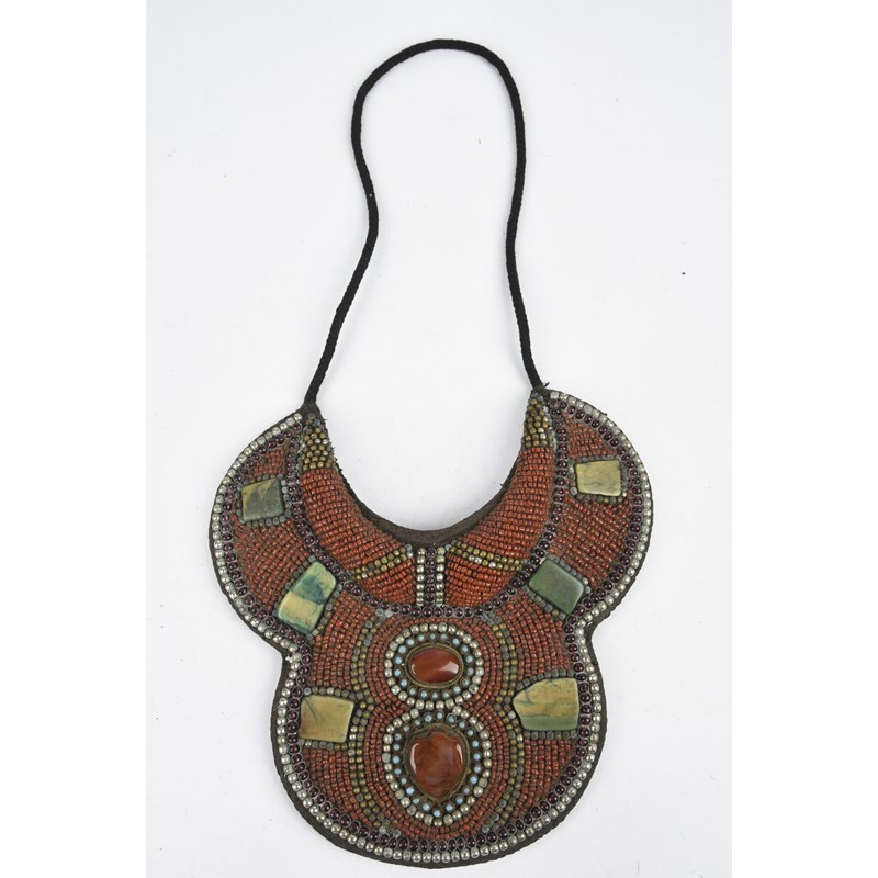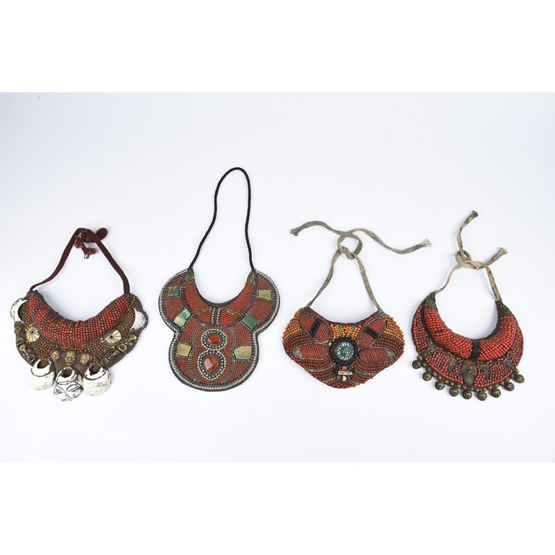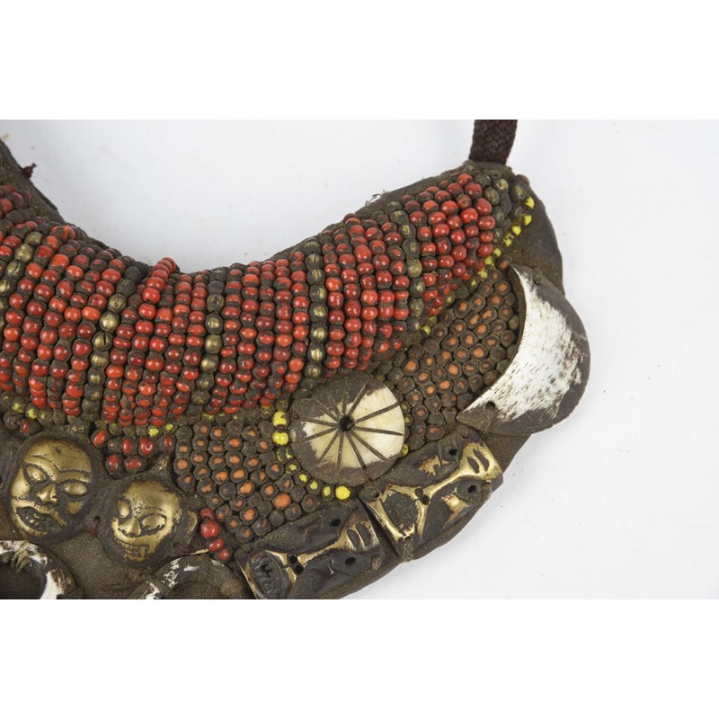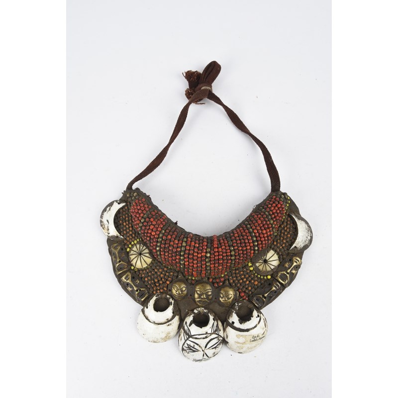 coloured glass beads, turquoise, bone, brass and silver coloured metal beads, shells and brass masks, skulls and bells,