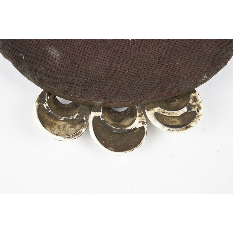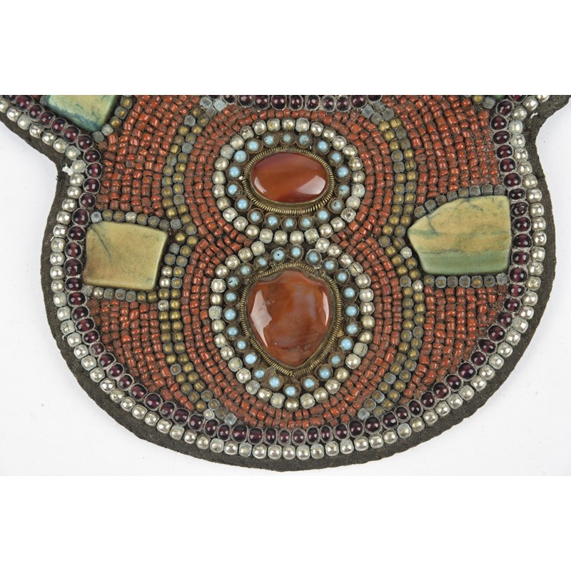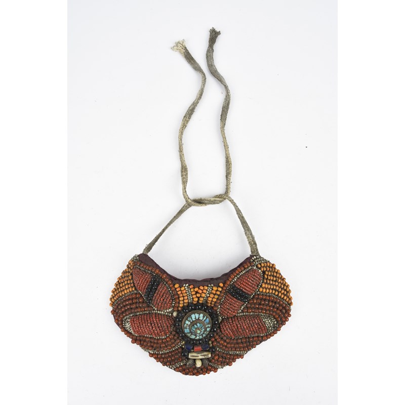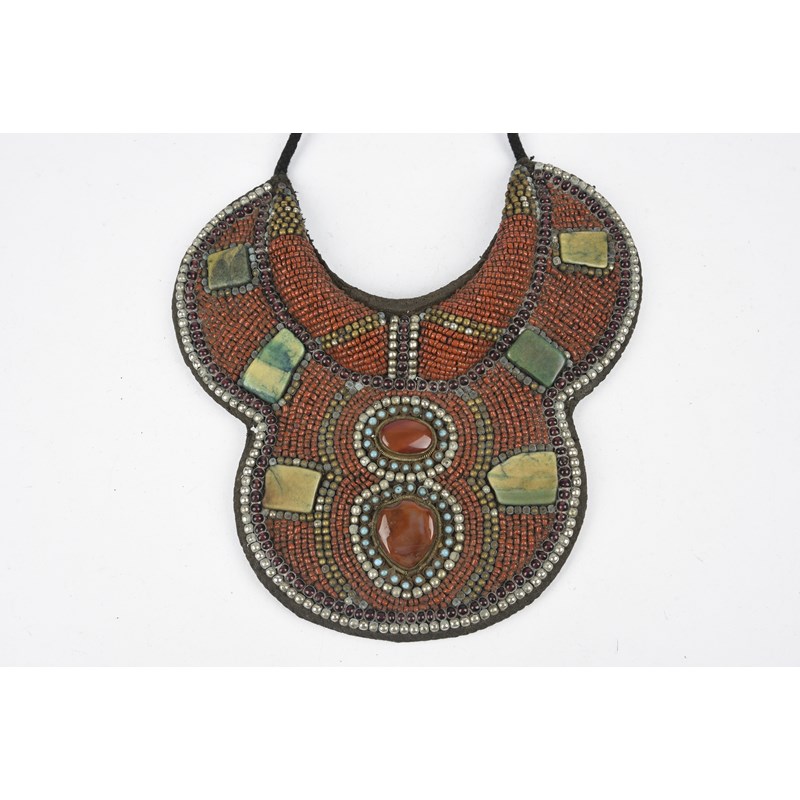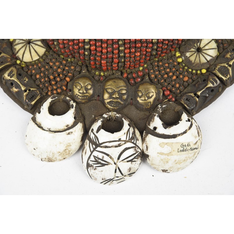 coloured glass beads, turquoise, bone, brass and silver coloured metal beads, shells and brass masks, skulls and bells,