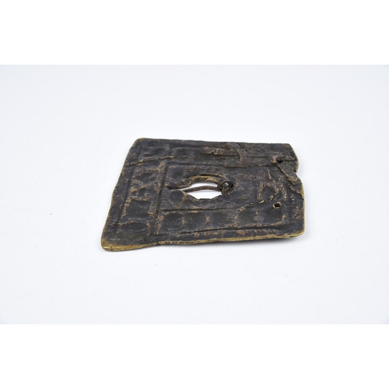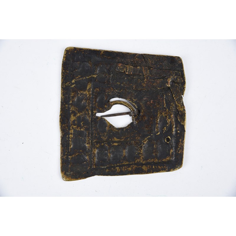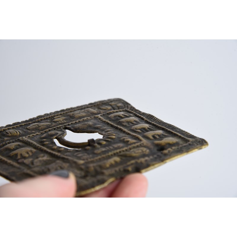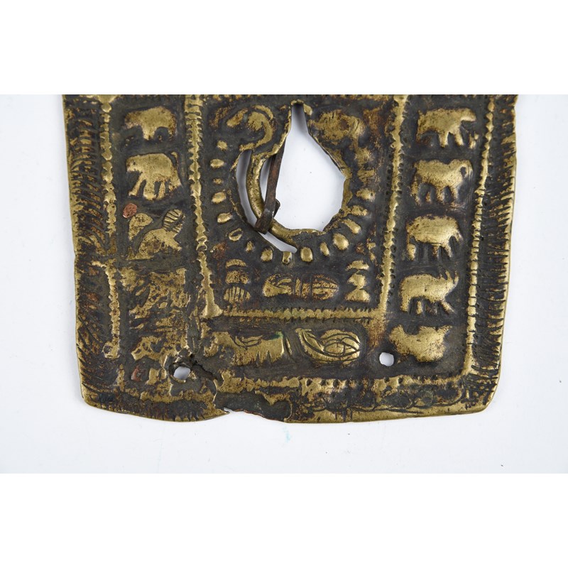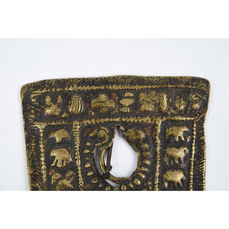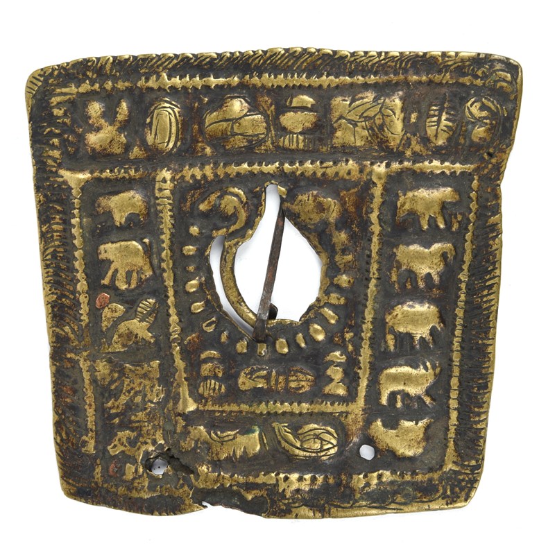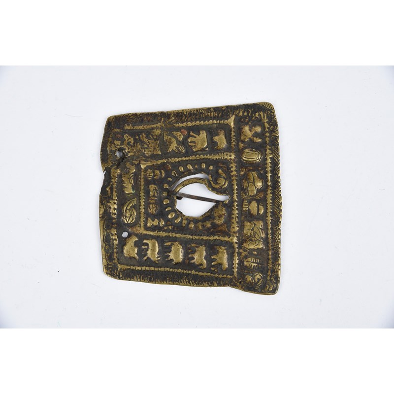 cast brass with twelve zodiac animals and auspicious emblems along the top, the pierced centre with a clasp and a vajra motif below,