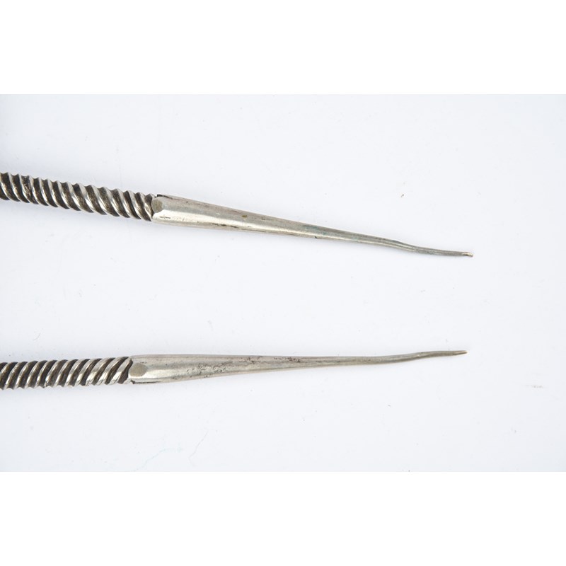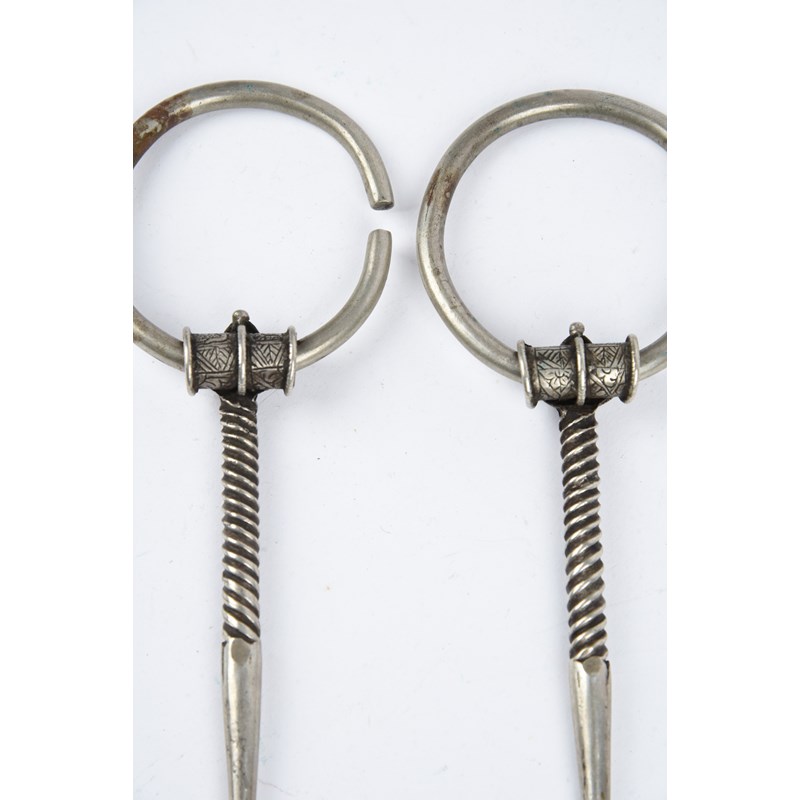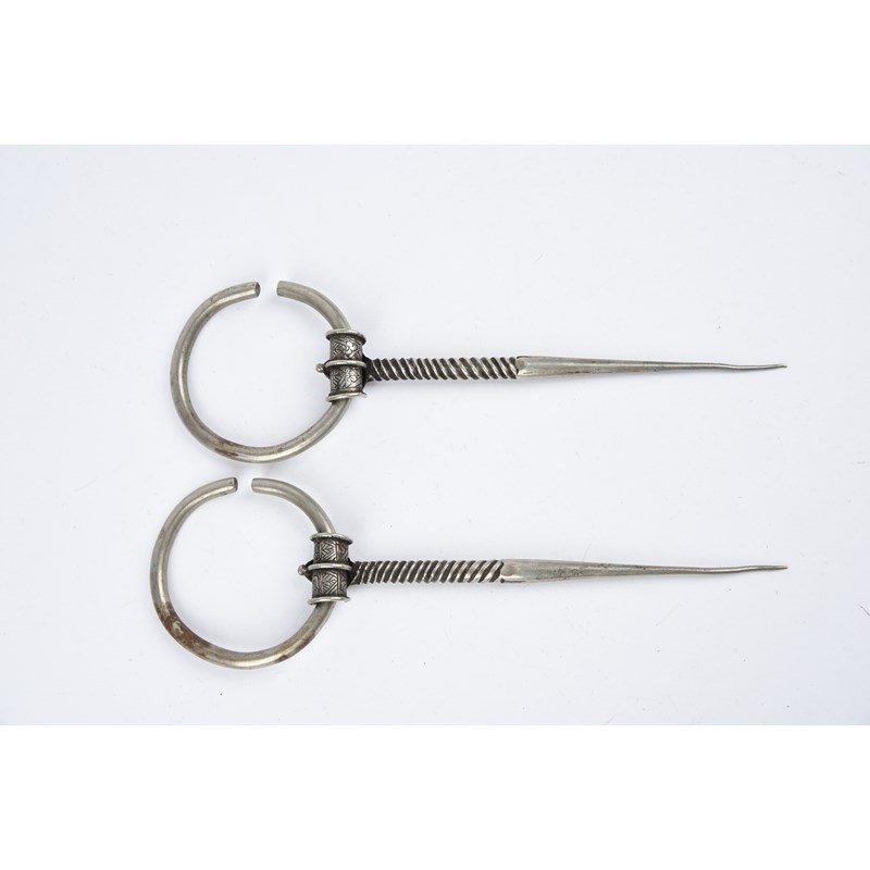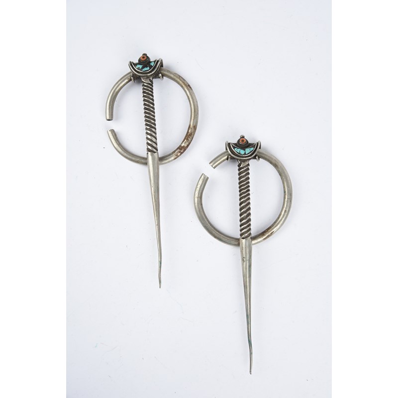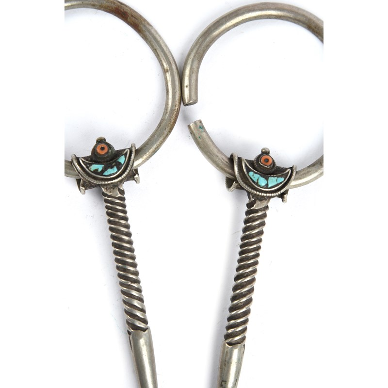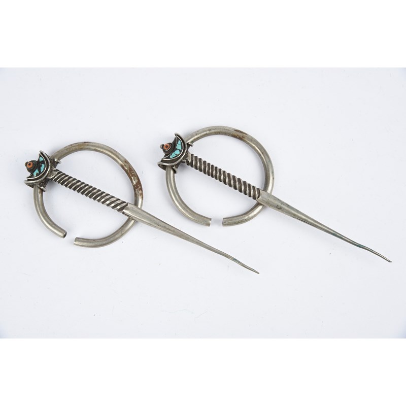 silver coloured metal with decoration to the back of the top tube and with inset turquoise and coral,