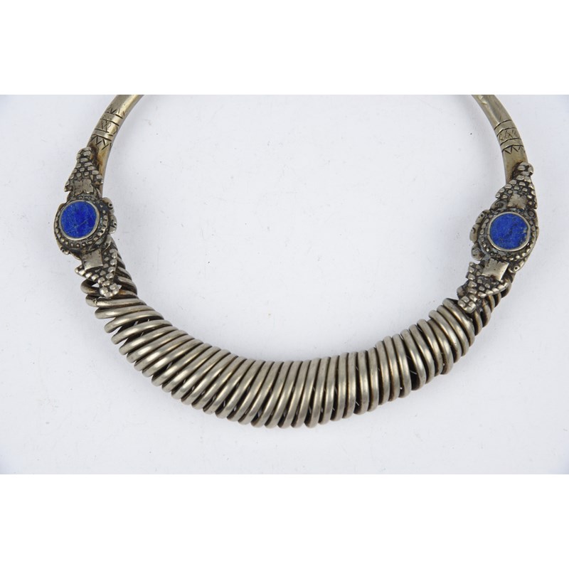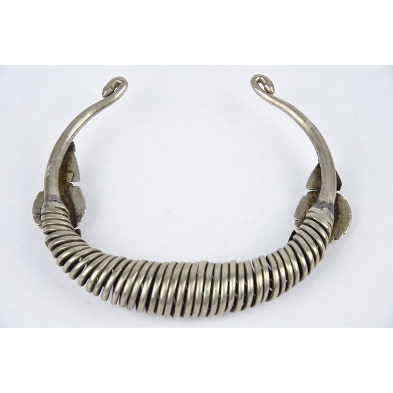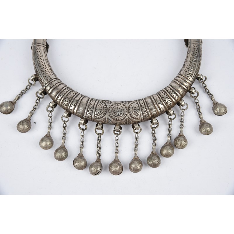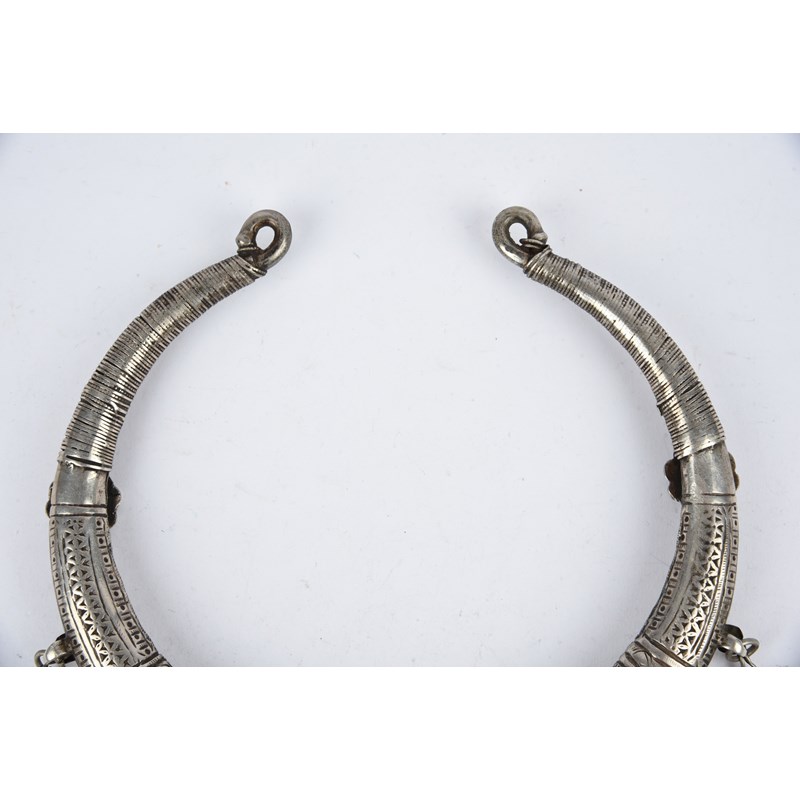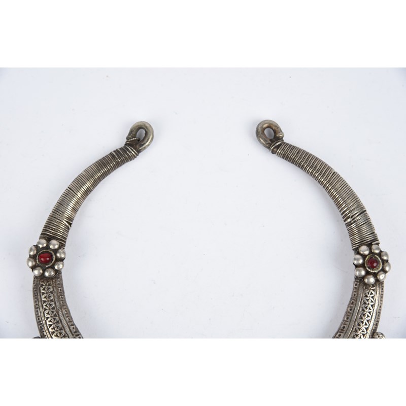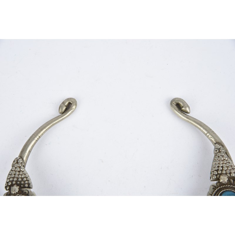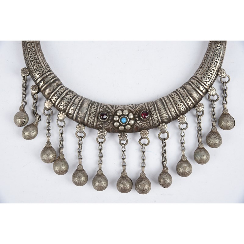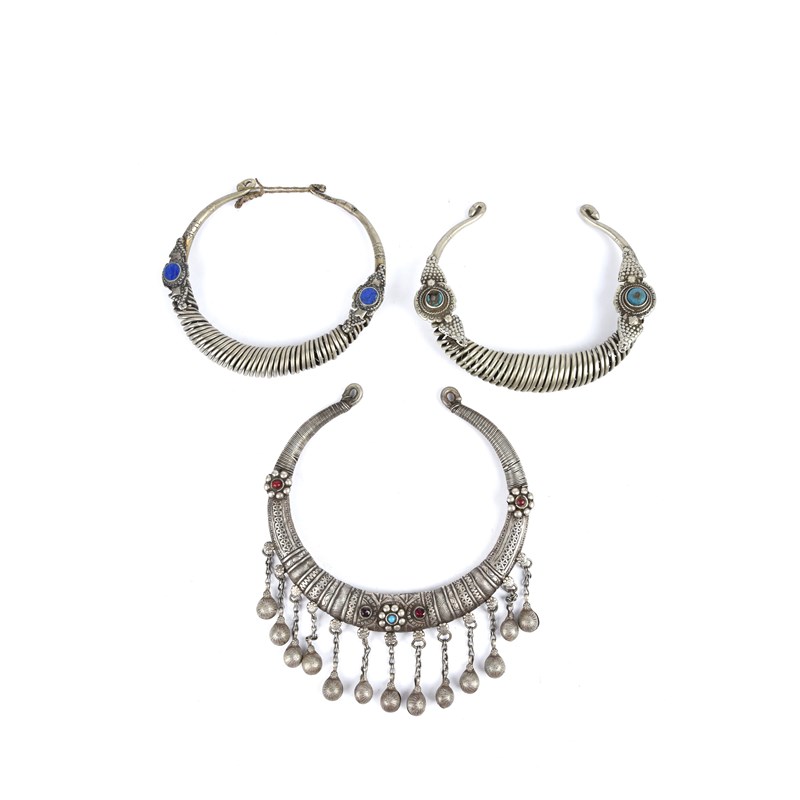 silver coloured metal with applied blue stone and red and blue glass beads, the larger with chased decoration and hung with bells, 20.5cm wide. (3)