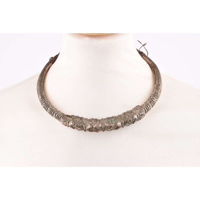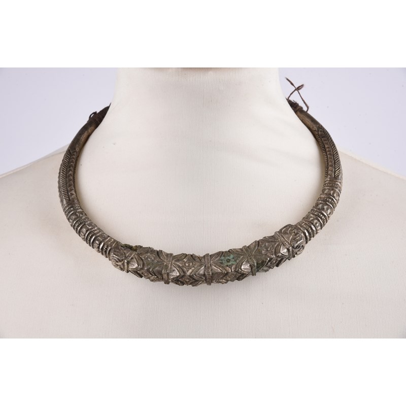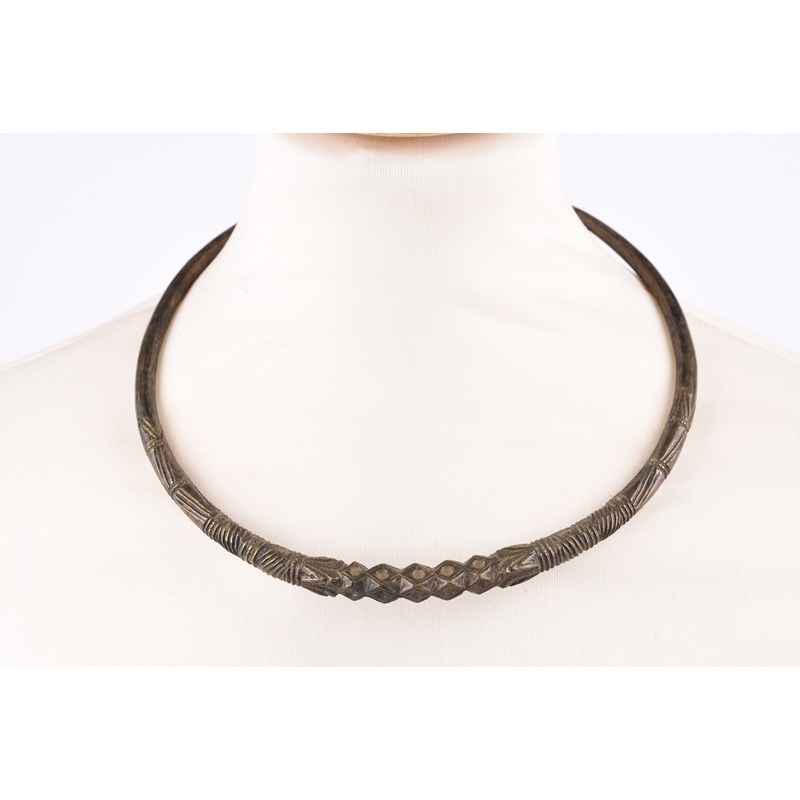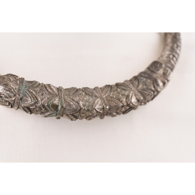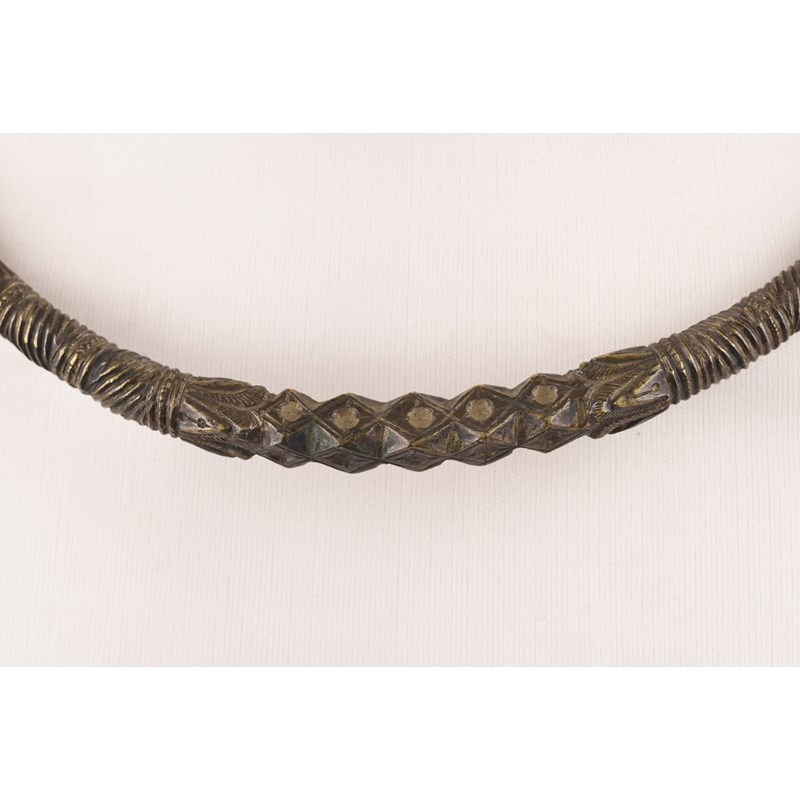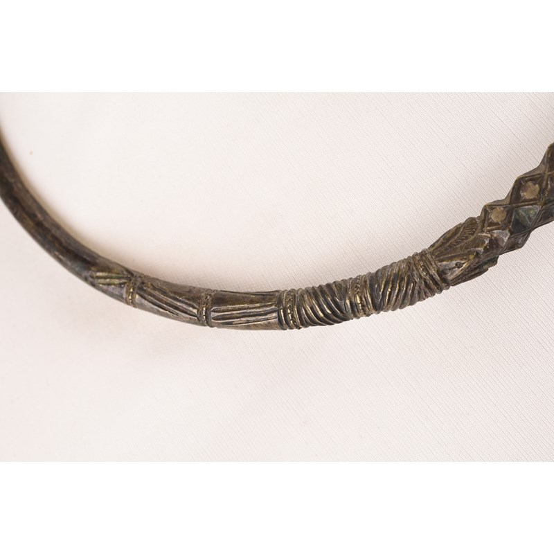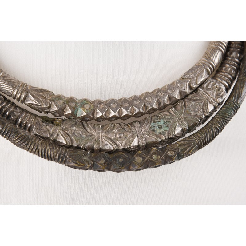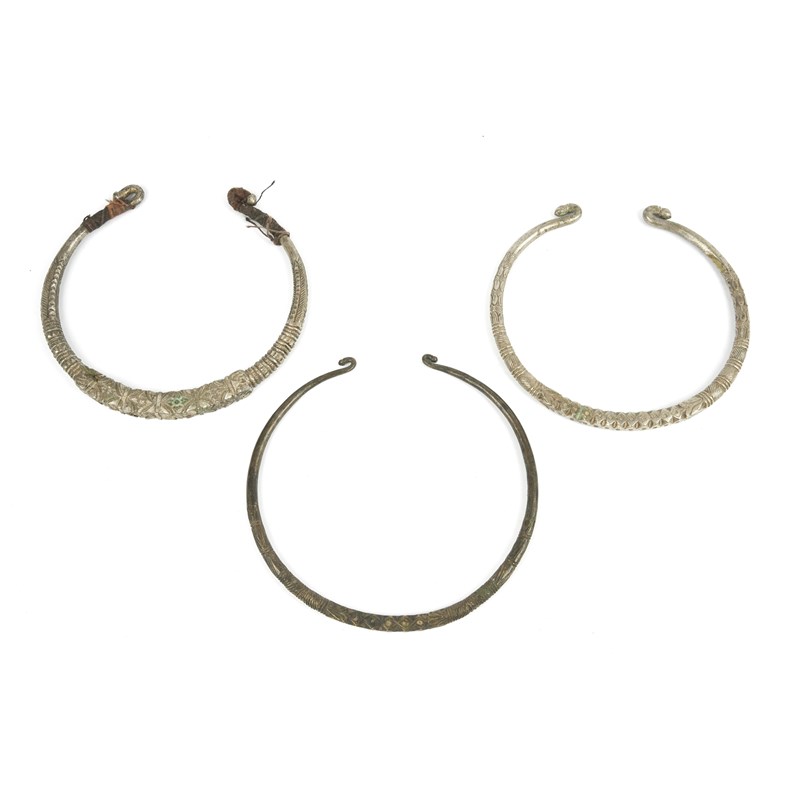 cast base metal and bronze with chiselled decoration, one with fibre binding,