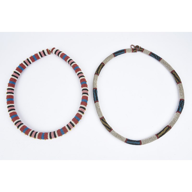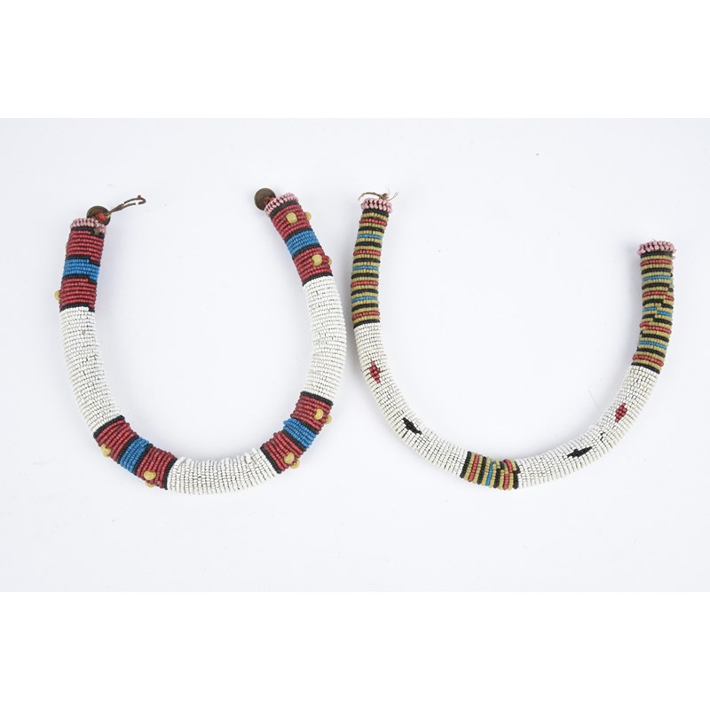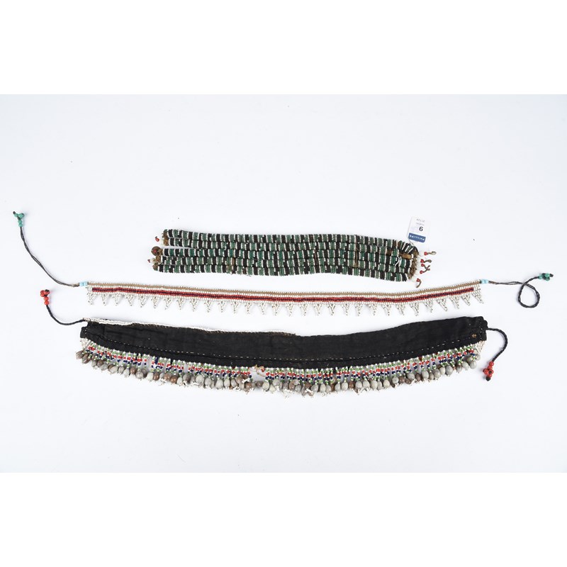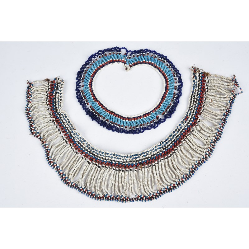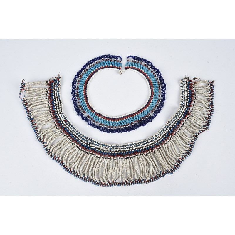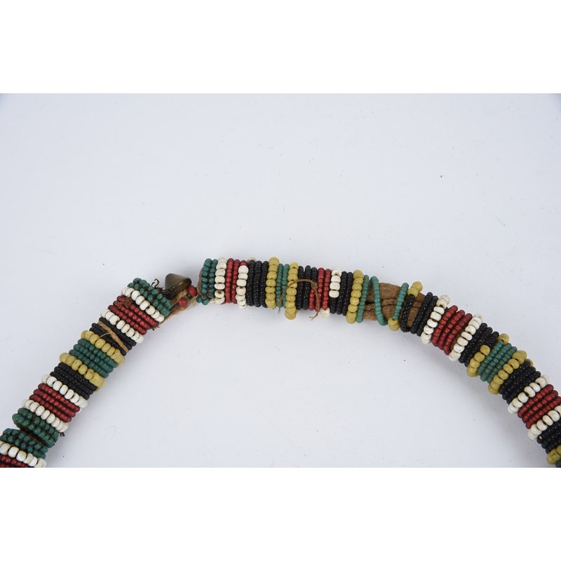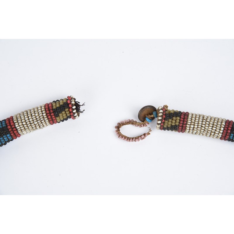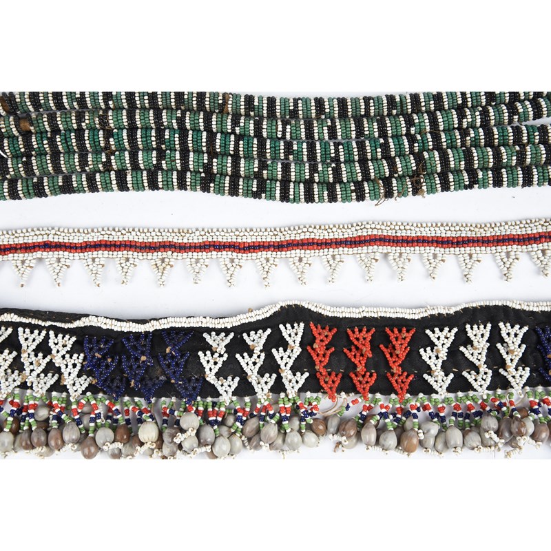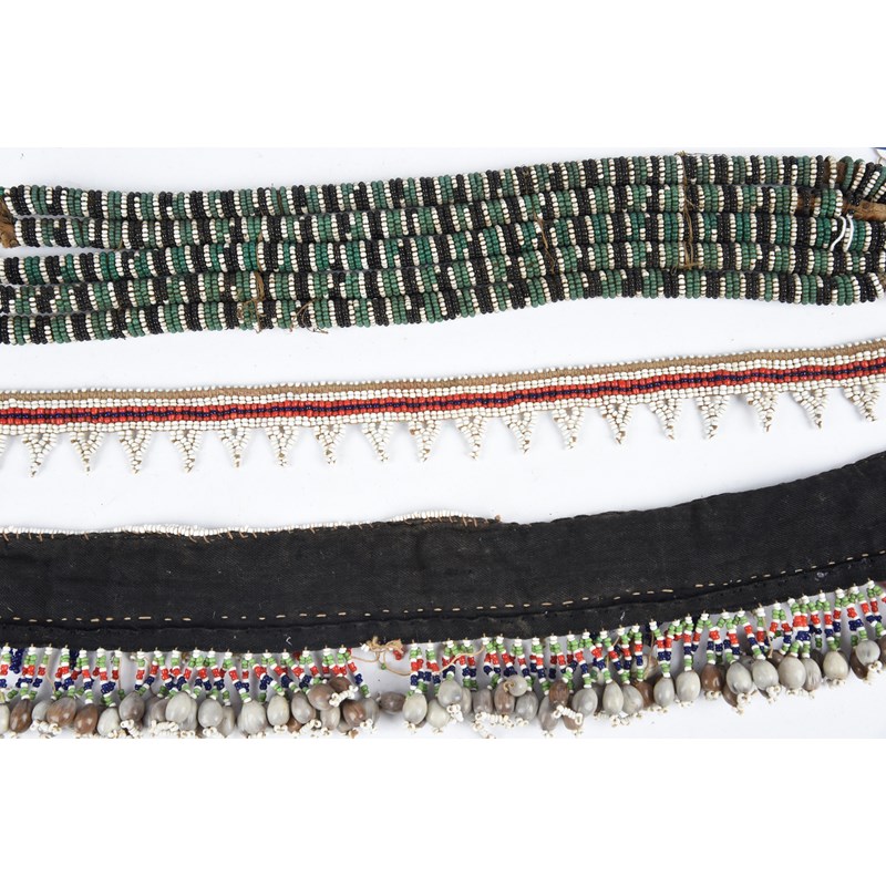 three South African beaded waistbands, three South African beaded panels and seven Zulu neckbands, coloured glass beads, one with a bone ring pendant with incised dot decoration, 31cm wide, and three with brass button fasteners. (16)