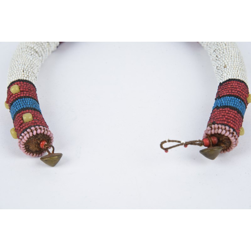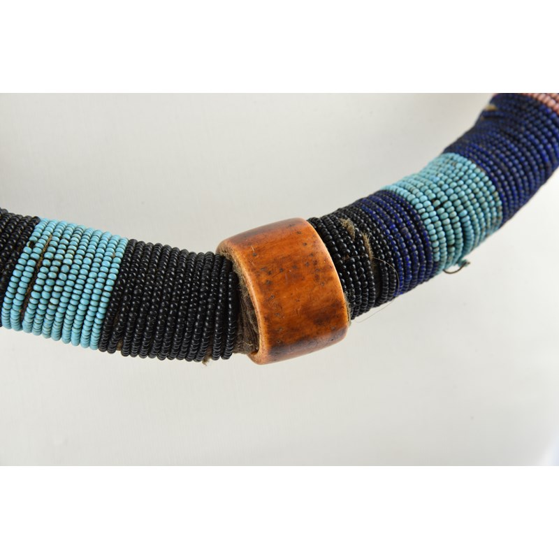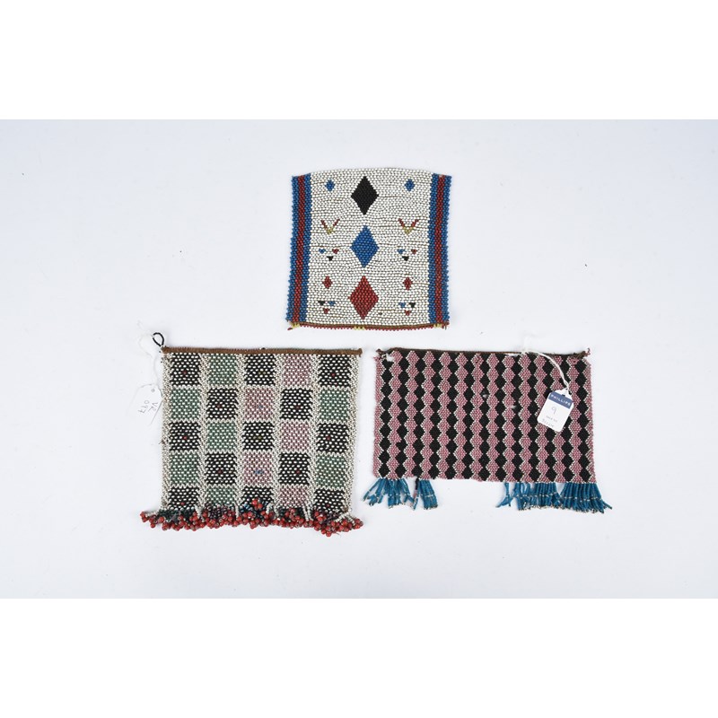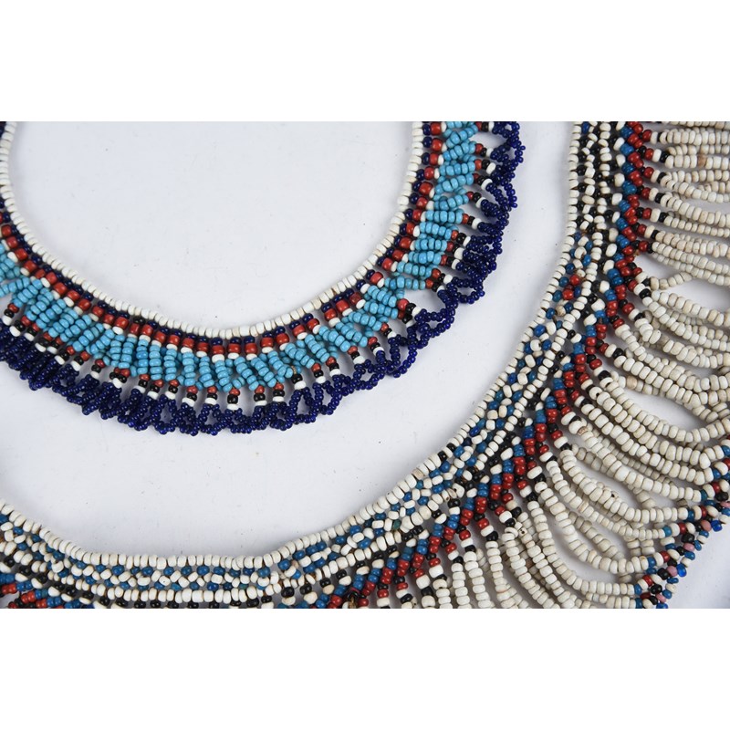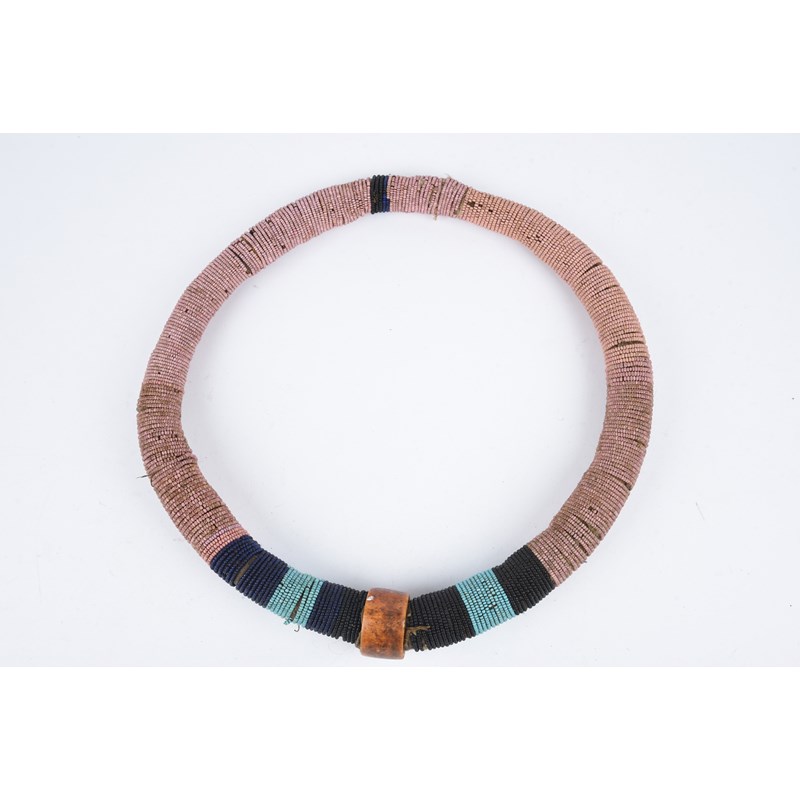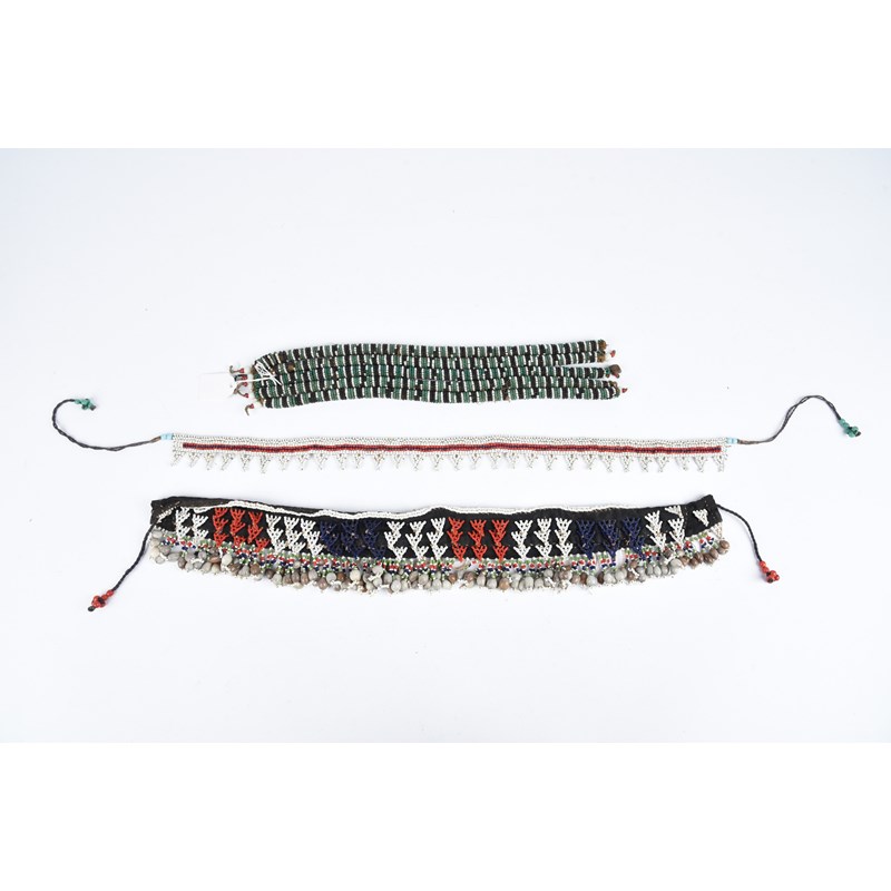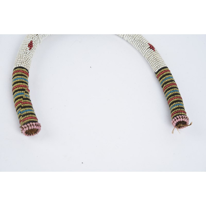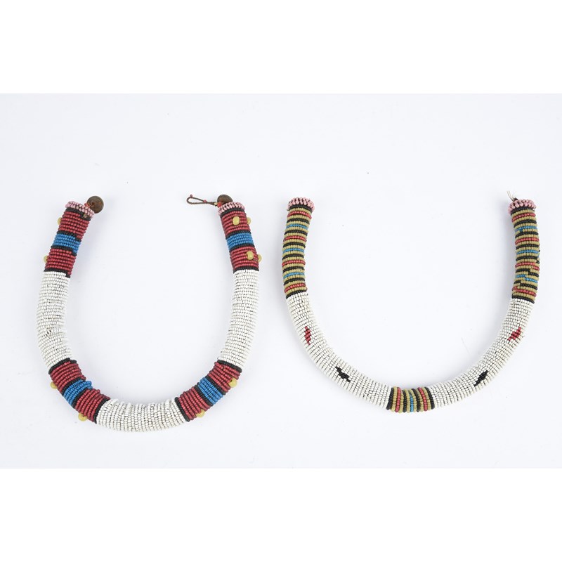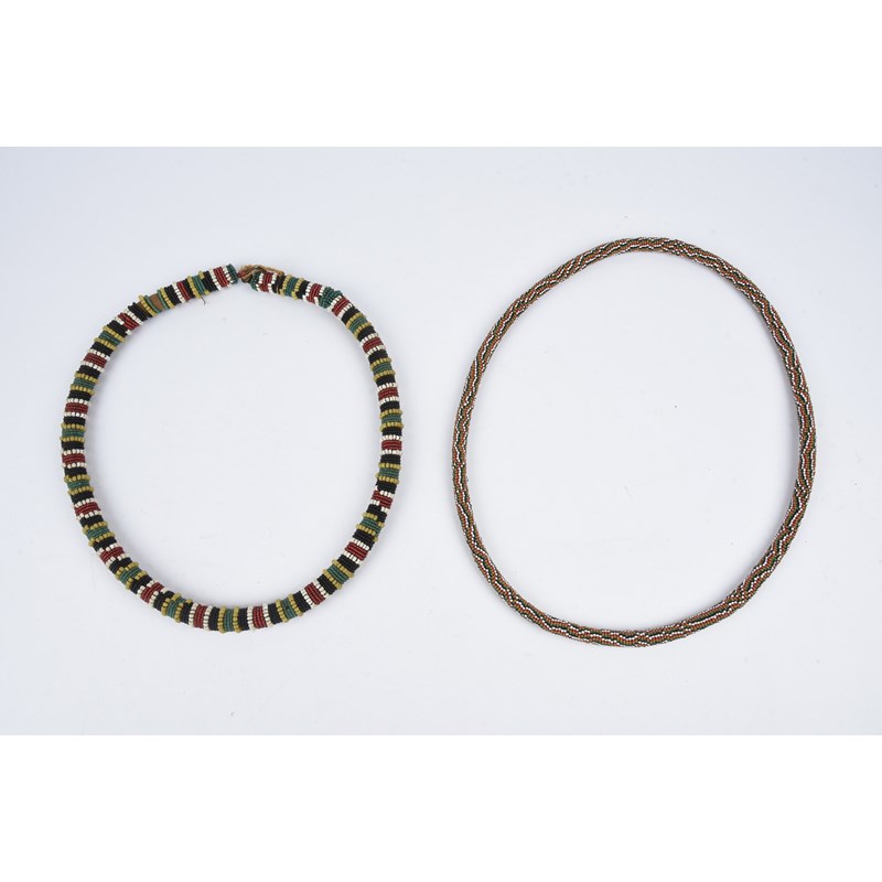 three South African beaded waistbands, three South African beaded panels and seven Zulu neckbands, coloured glass beads, one with a bone ring pendant with incised dot decoration, 31cm wide, and three with brass button fasteners. (16)