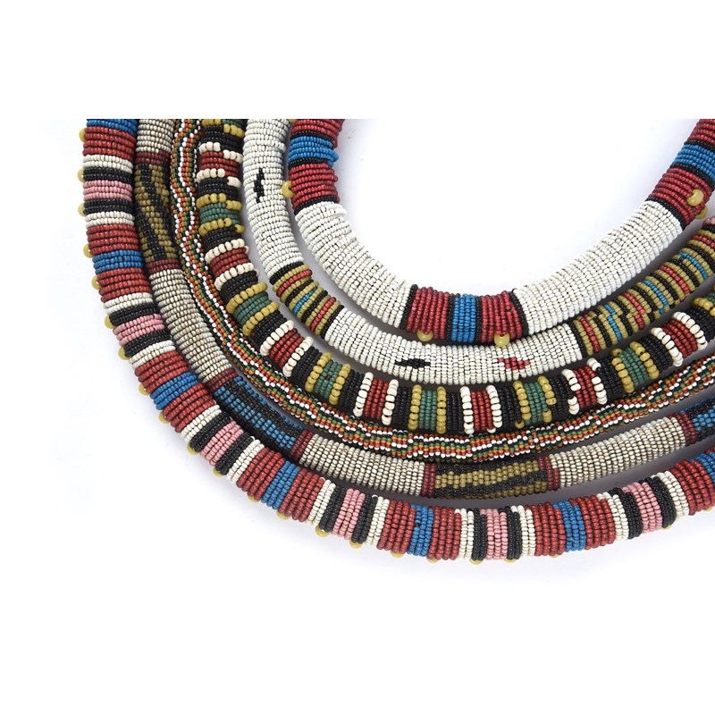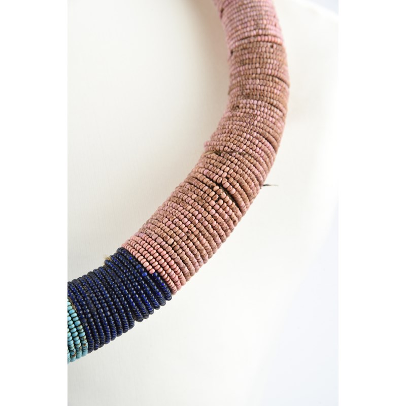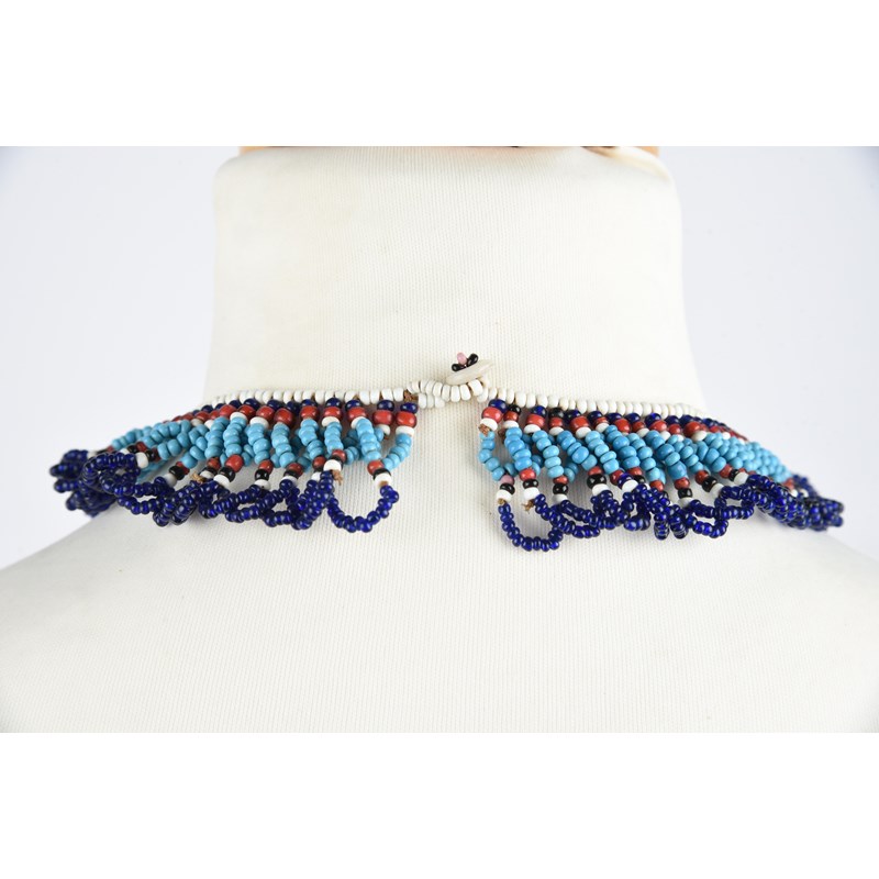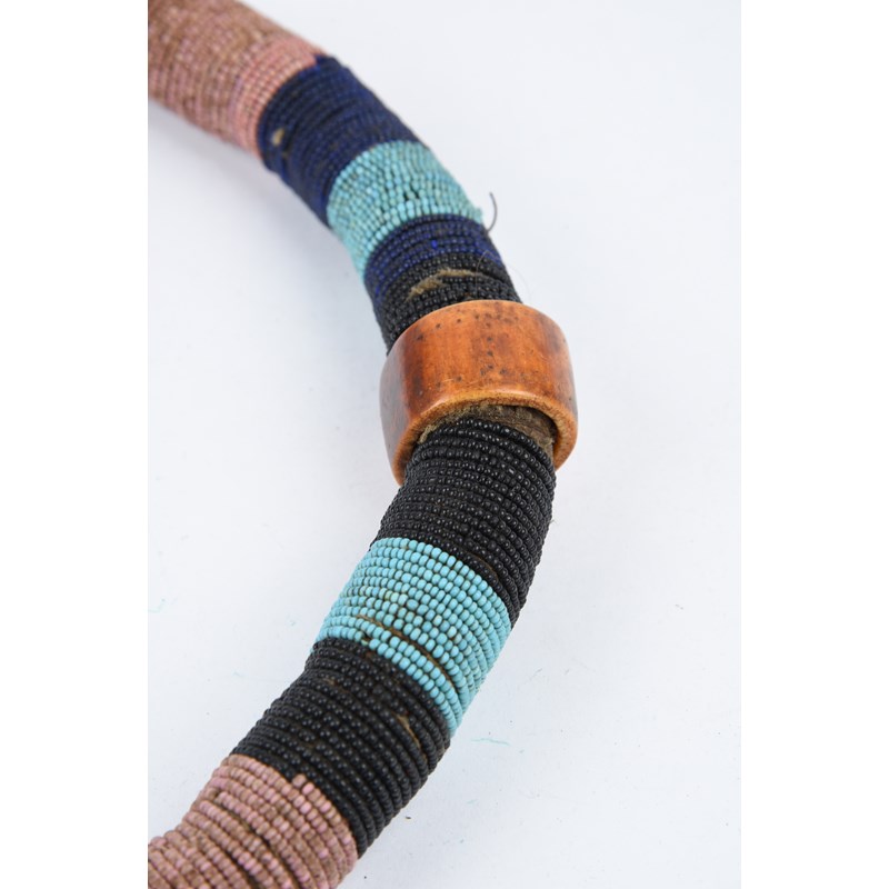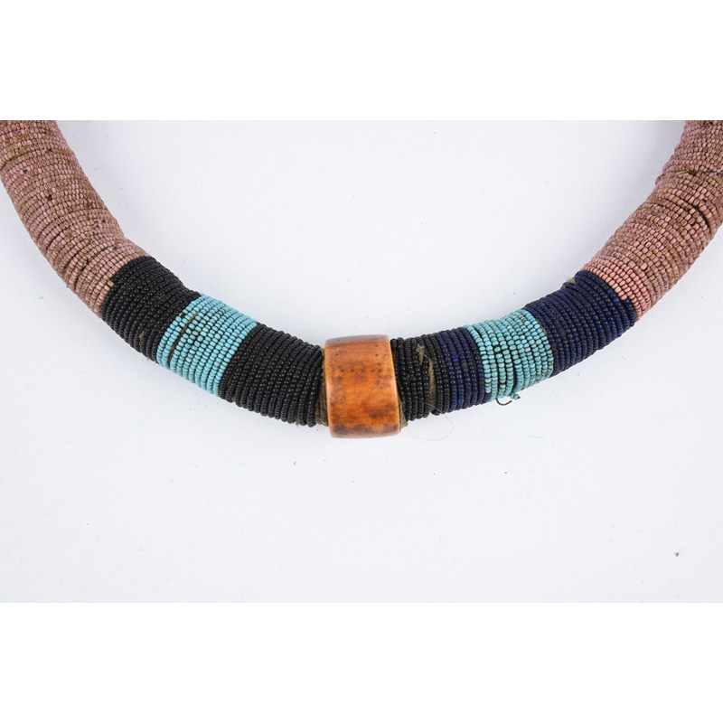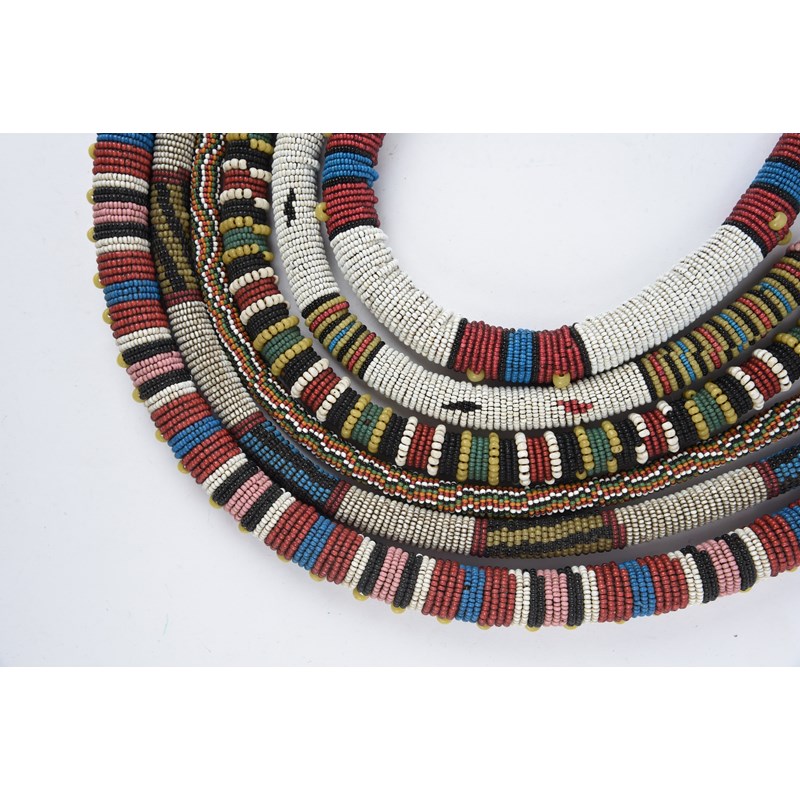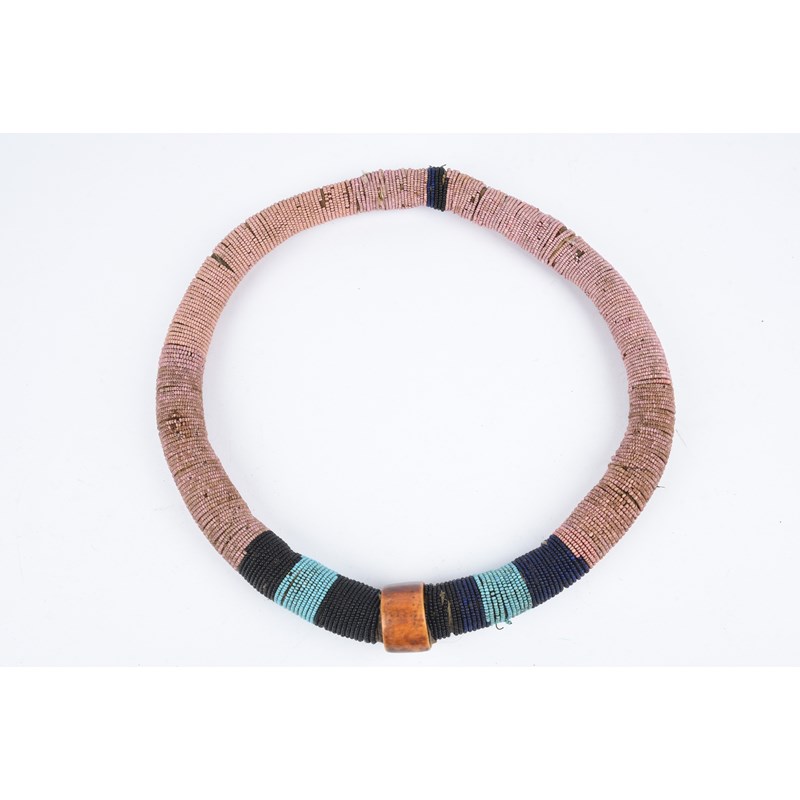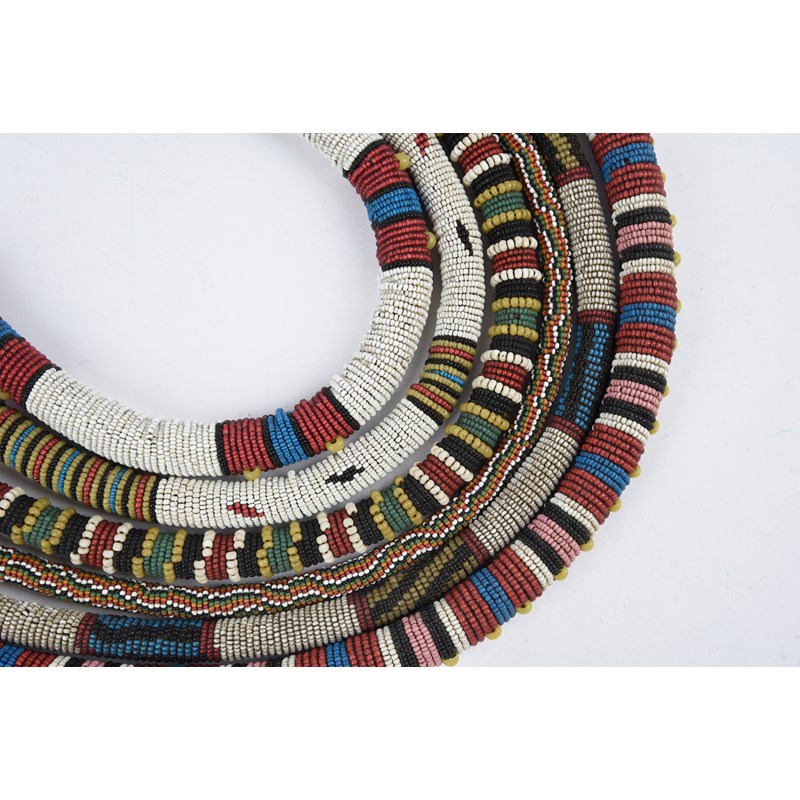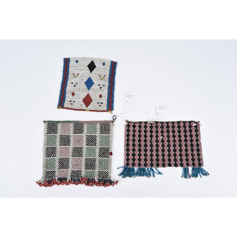 three South African beaded waistbands, three South African beaded panels and seven Zulu neckbands, coloured glass beads, one with a bone ring pendant with incised dot decoration, 31cm wide, and three with brass button fasteners. (16)