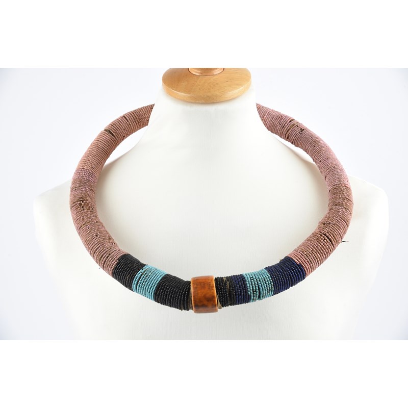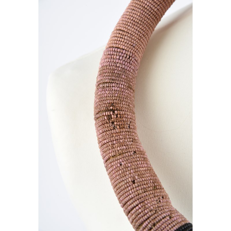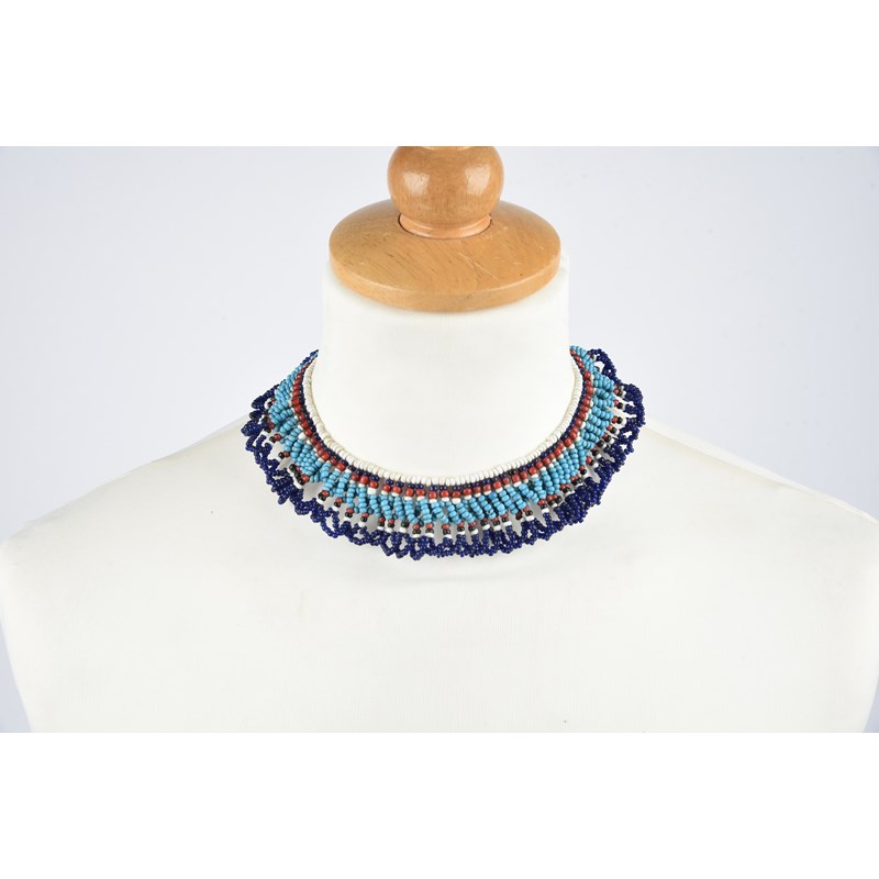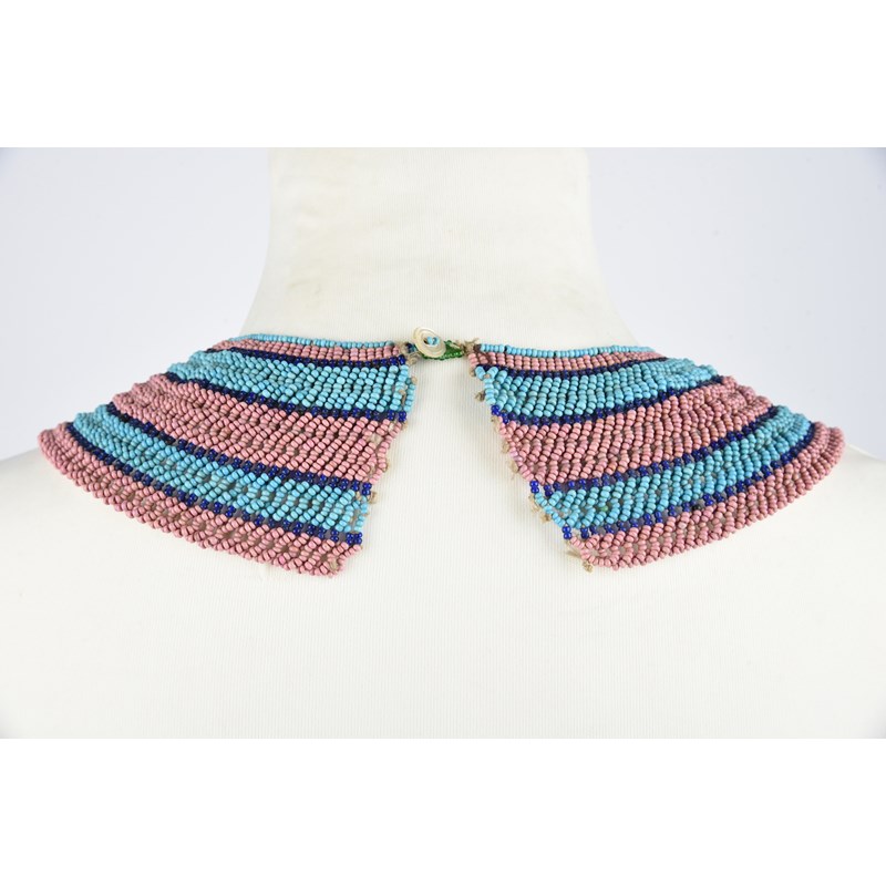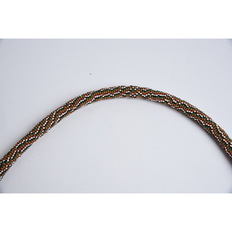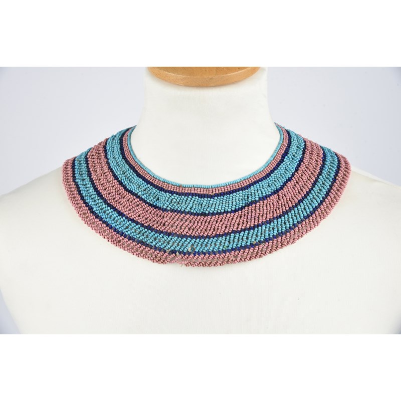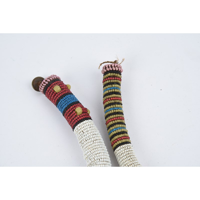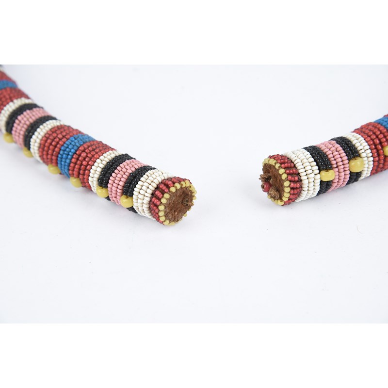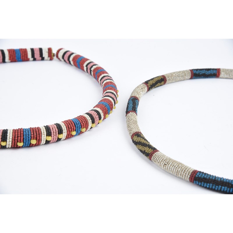 three South African beaded waistbands, three South African beaded panels and seven Zulu neckbands, coloured glass beads, one with a bone ring pendant with incised dot decoration, 31cm wide, and three with brass button fasteners. (16)