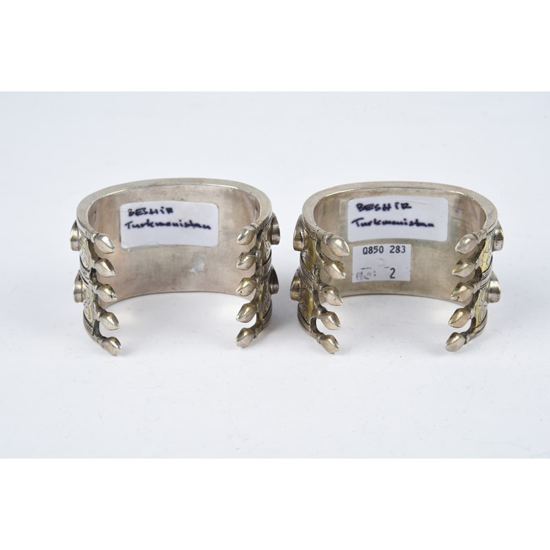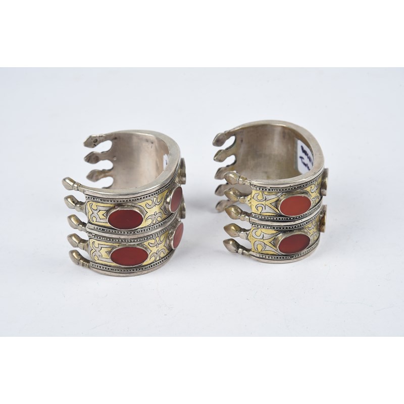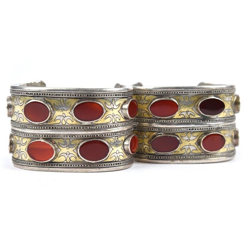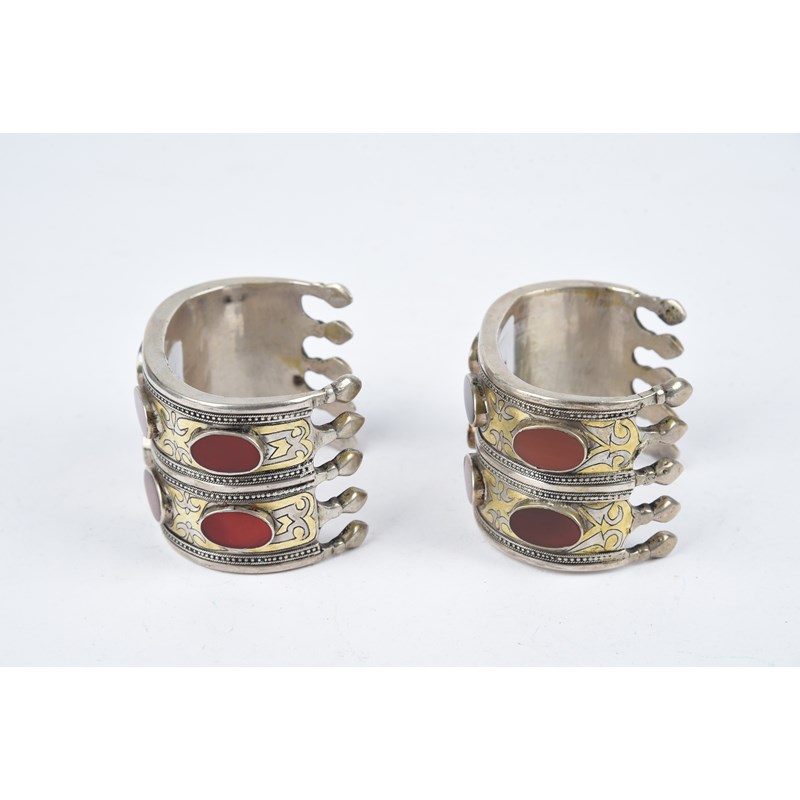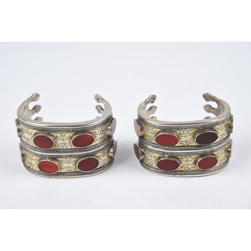 silver coloured metal, parcel gilt and each with eight inset oval carnelians,