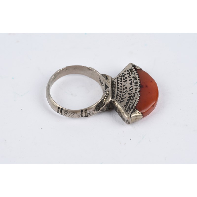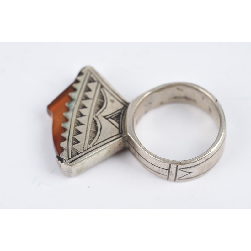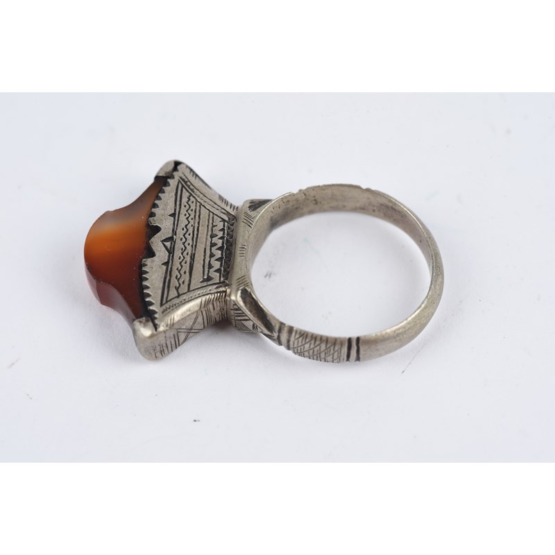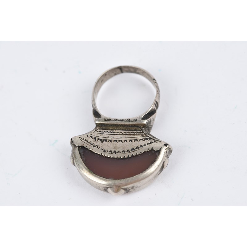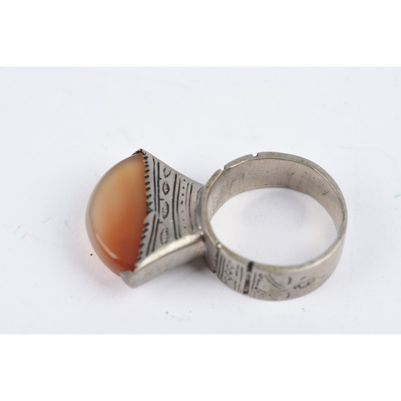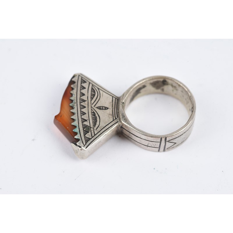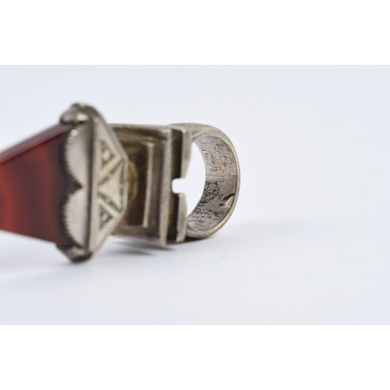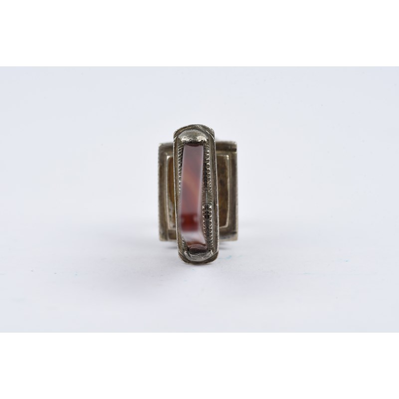 silver coloured metal, with engraved decoration, eight with carnelian,