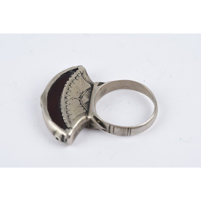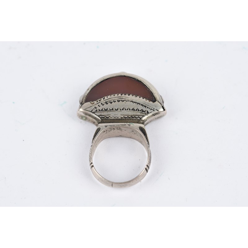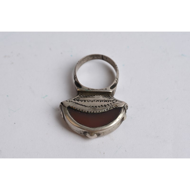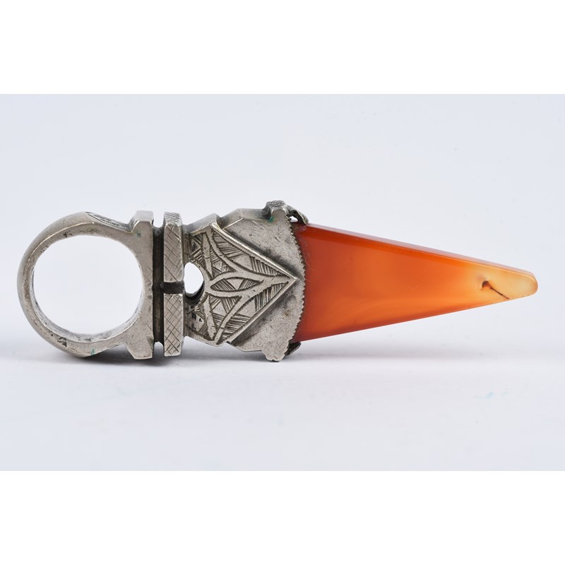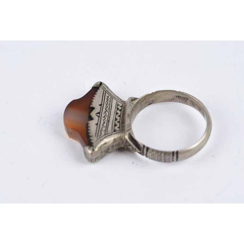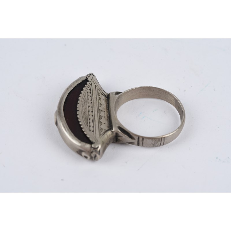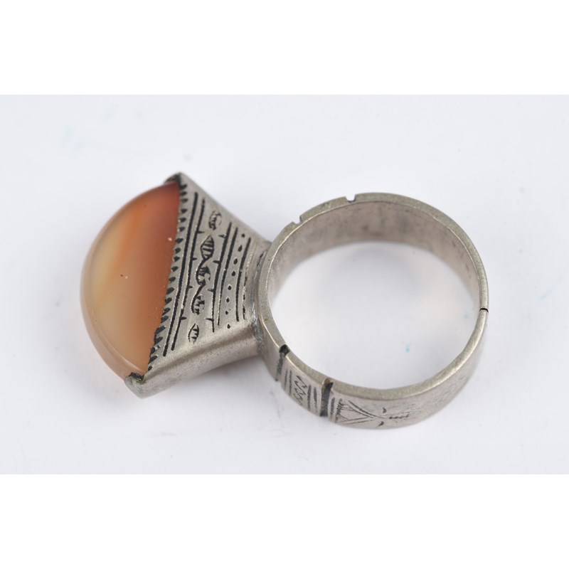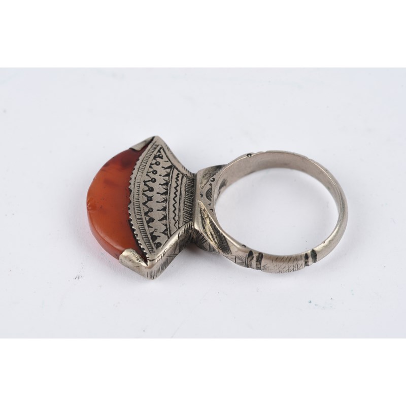 silver coloured metal, with engraved decoration, eight with carnelian,