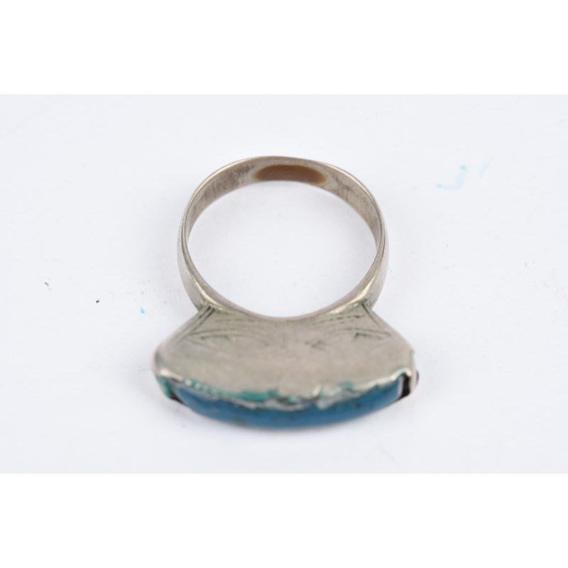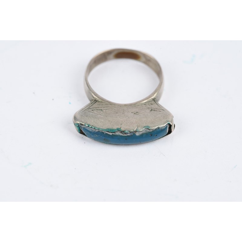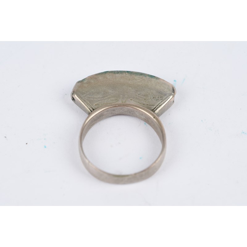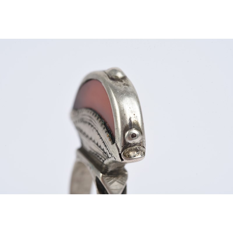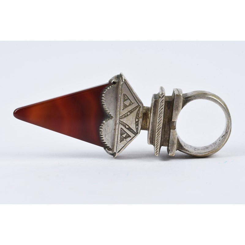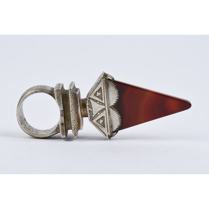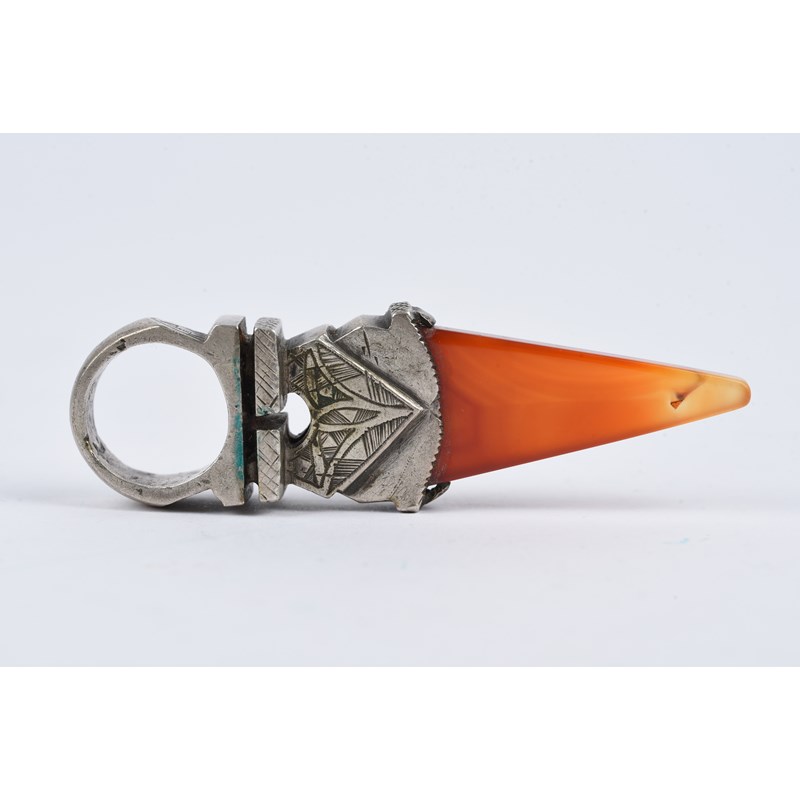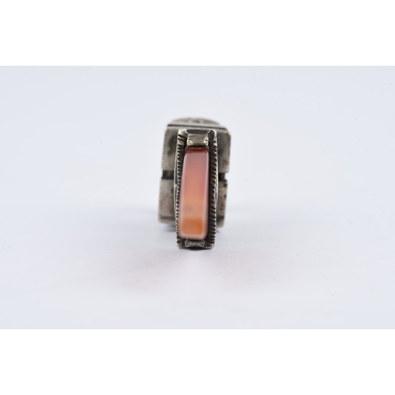 silver coloured metal, with engraved decoration, eight with carnelian,