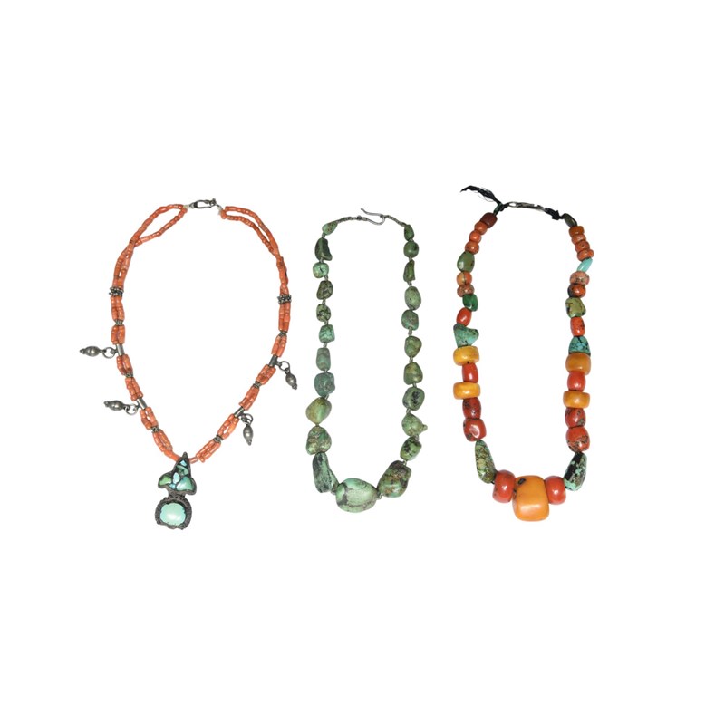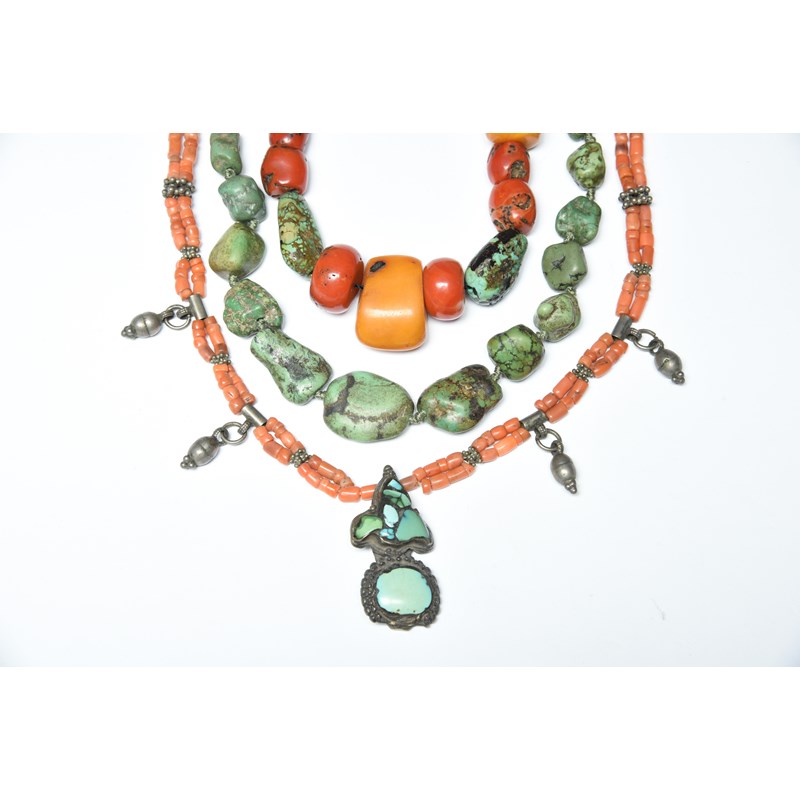 coral, turquoise, amber, one with silver coloured metal pendants,