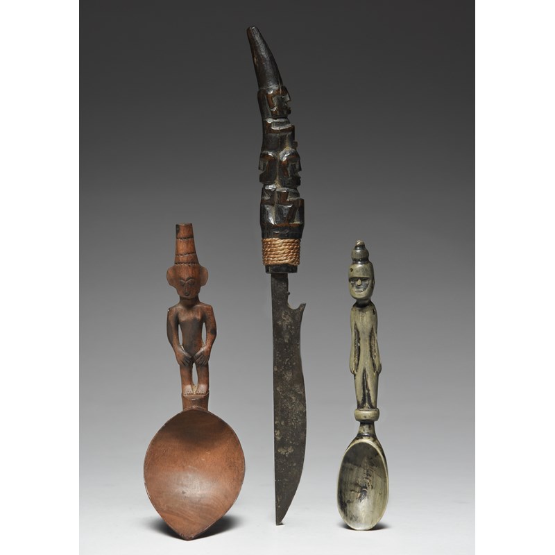 a Philippines horn spoon, with a figure handle, 17cm long, and a Philippines knife, with a wood handle, carved three figures, 30cm long. (3)