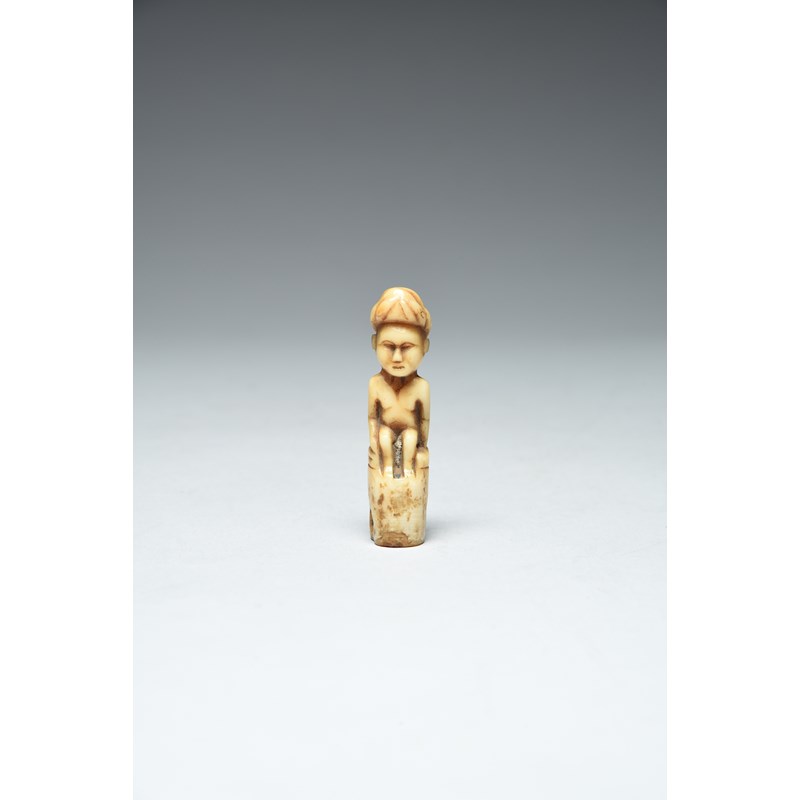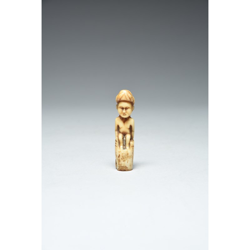 tooth, carved a seated figure wearing a headdress, the base pierced for attachment,