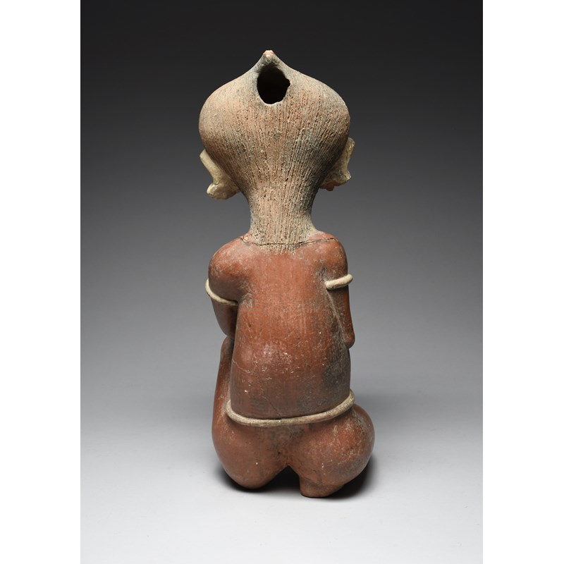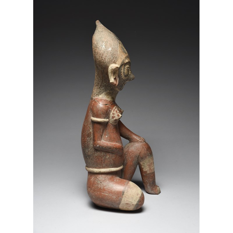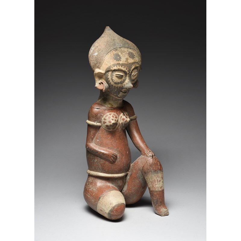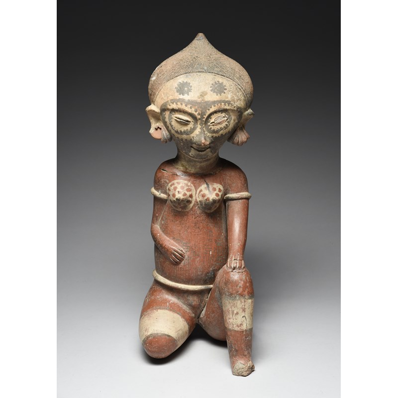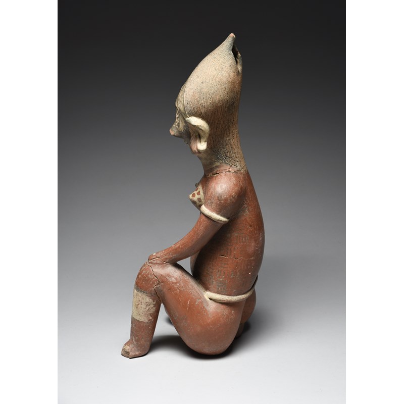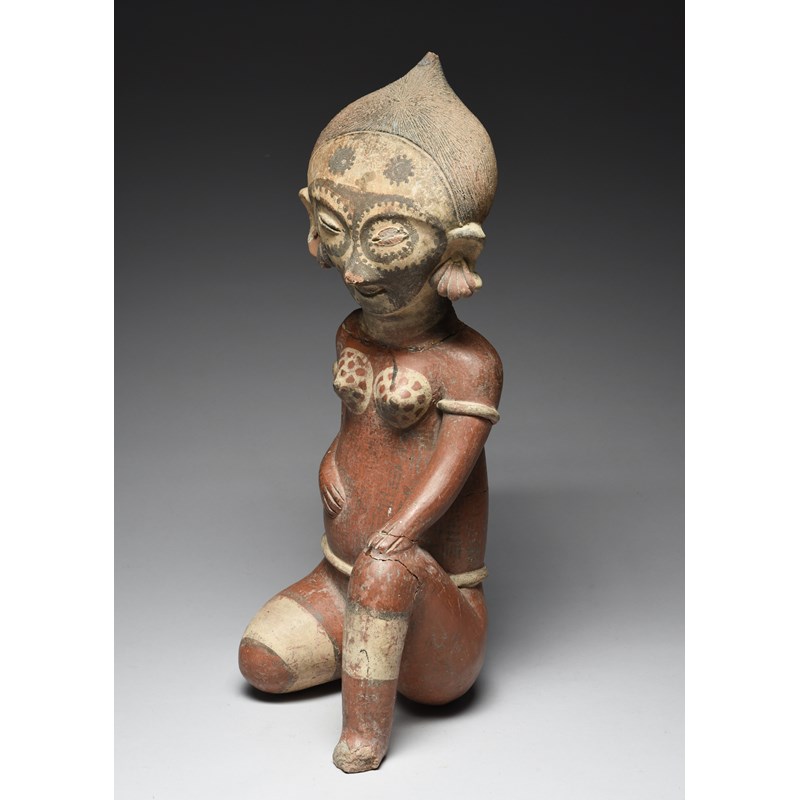 terracotta, with a pointed top finely incised linear coiffure, modelled wearing ear ornaments, armbands and a waist band, with a painted face, breasts and the body with a chequer linear textile design, and with banded legs,