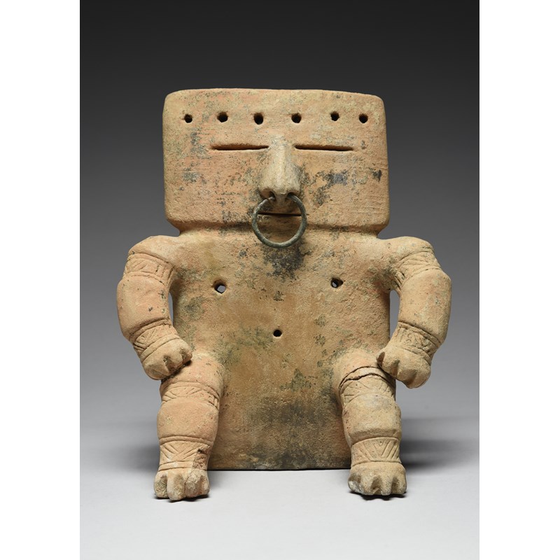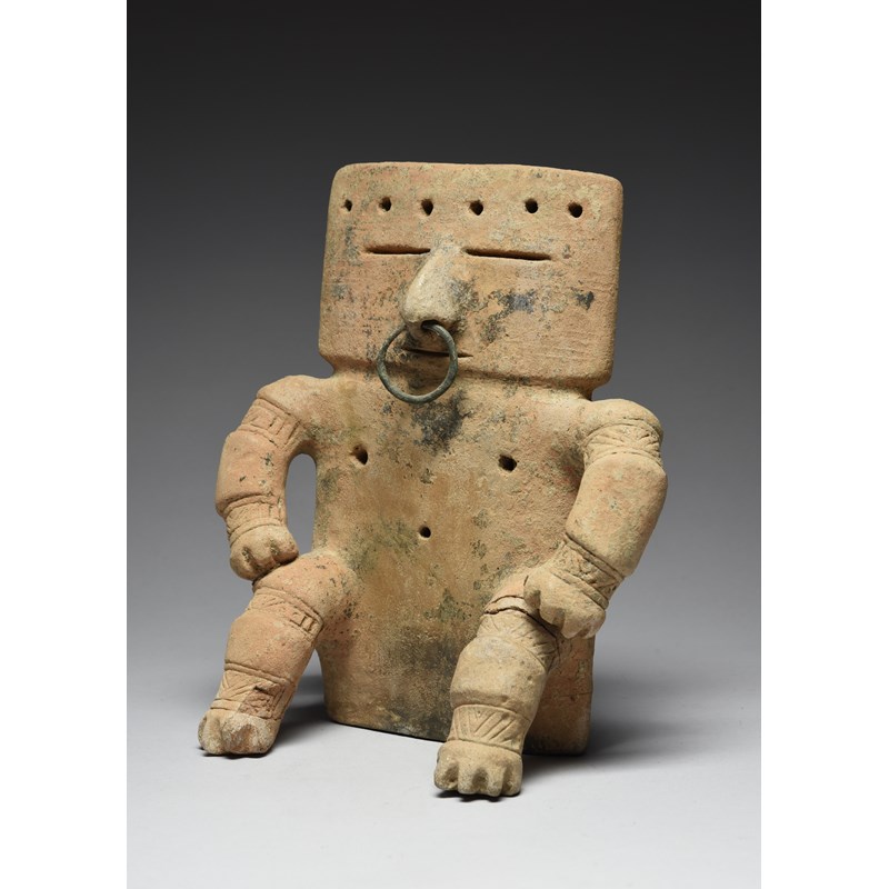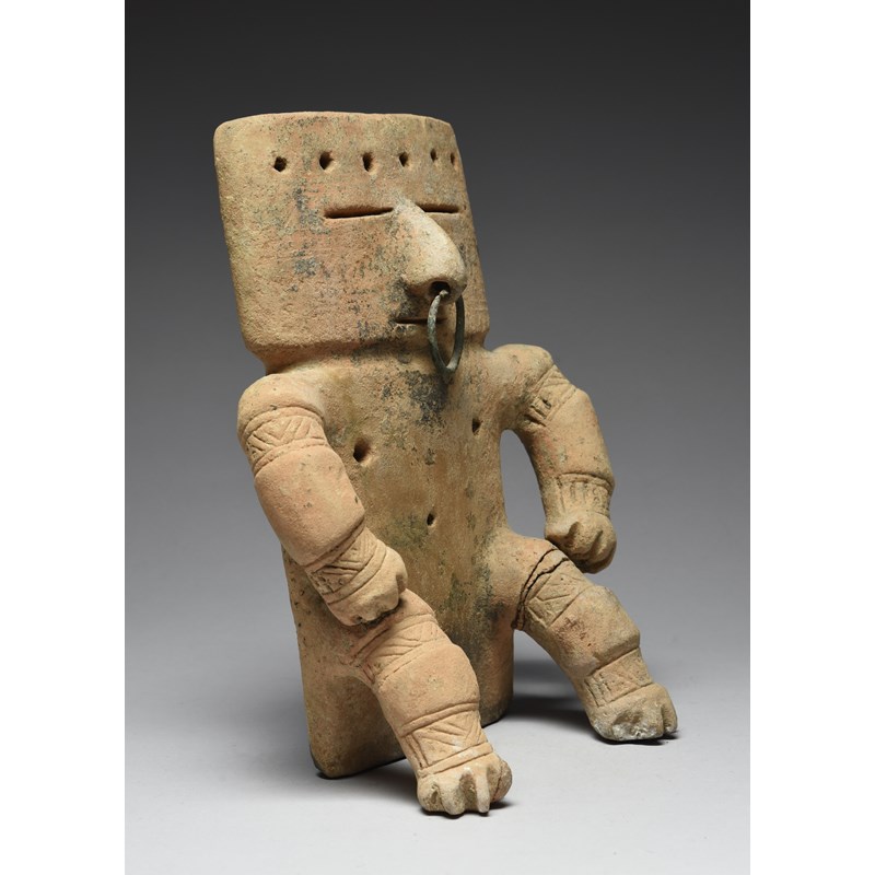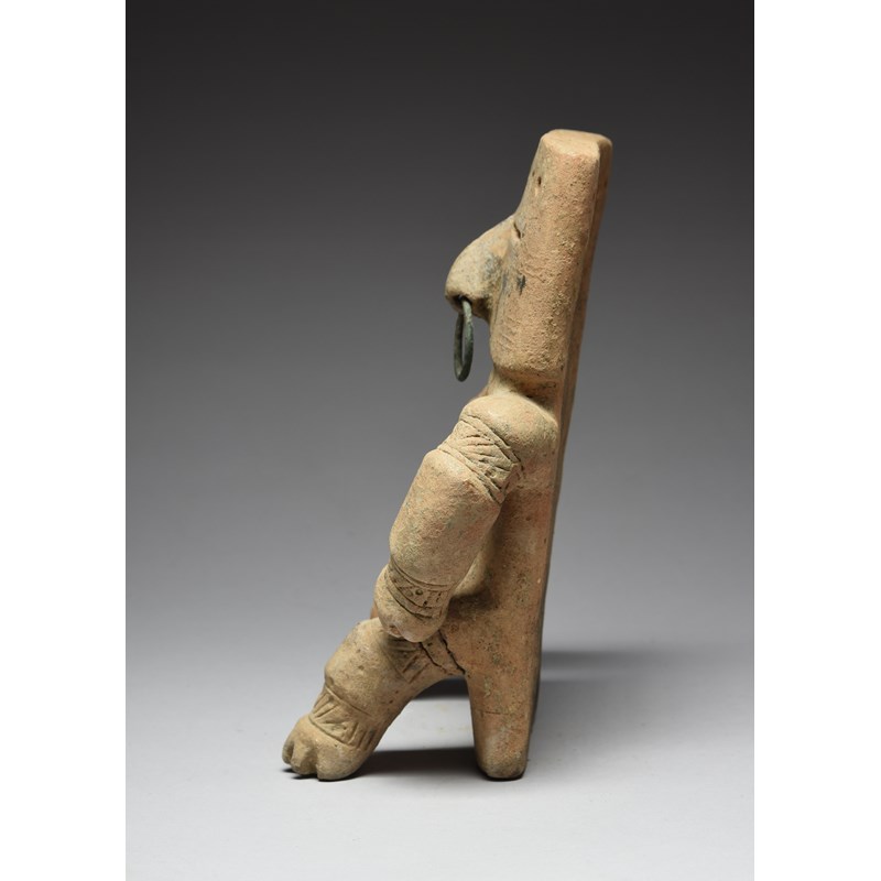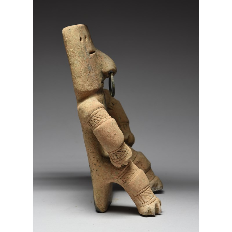 terracotta, pierced to the top of the head, forehead and body, with relief lines to the face and incised bands to the arms and legs, with a metal ring to the nose,
