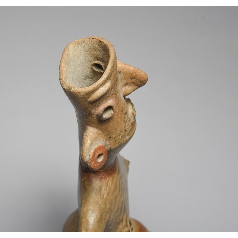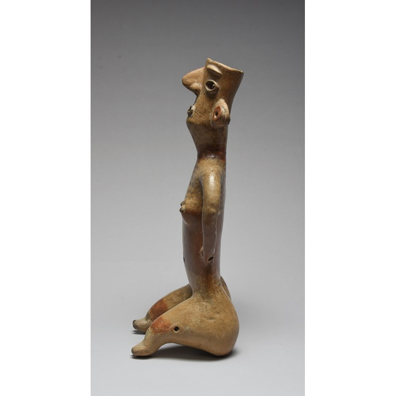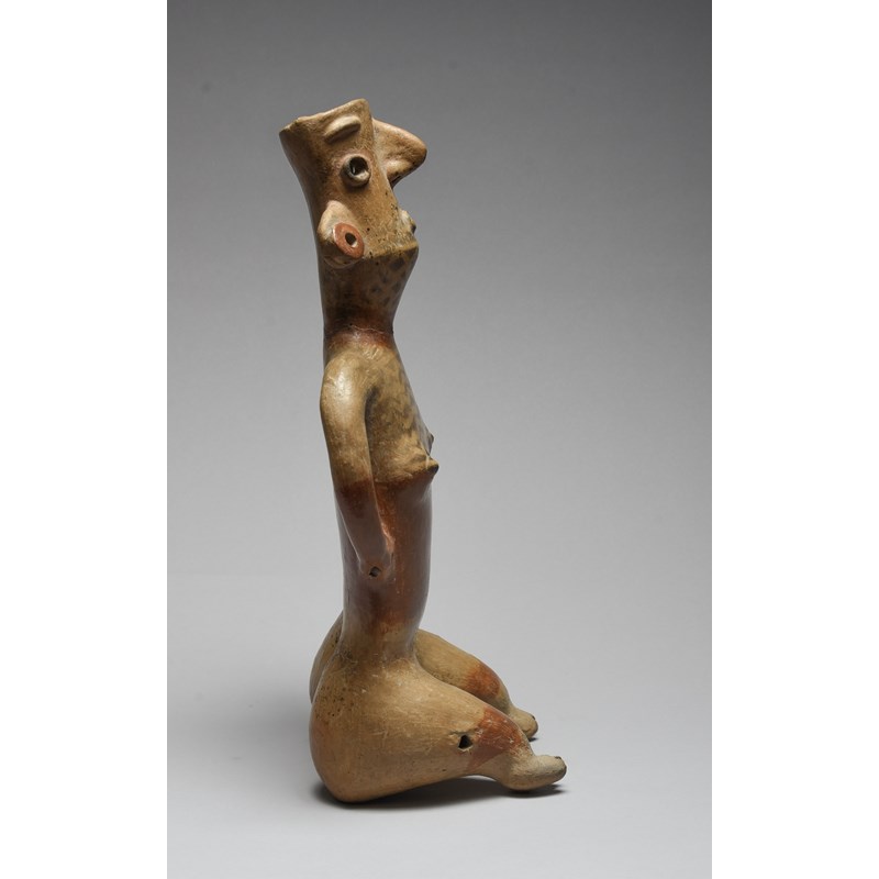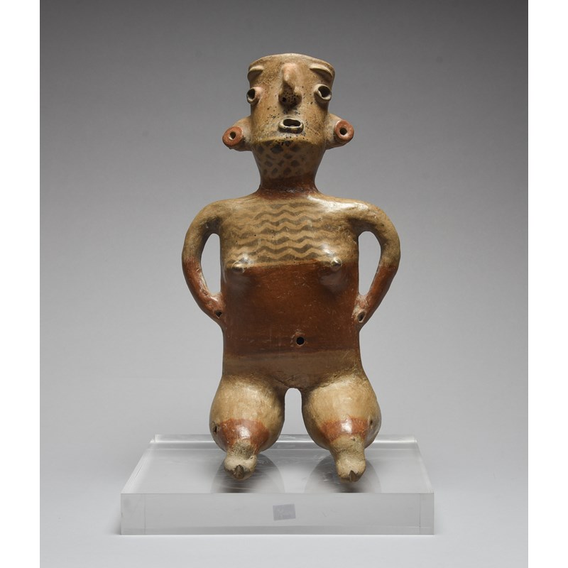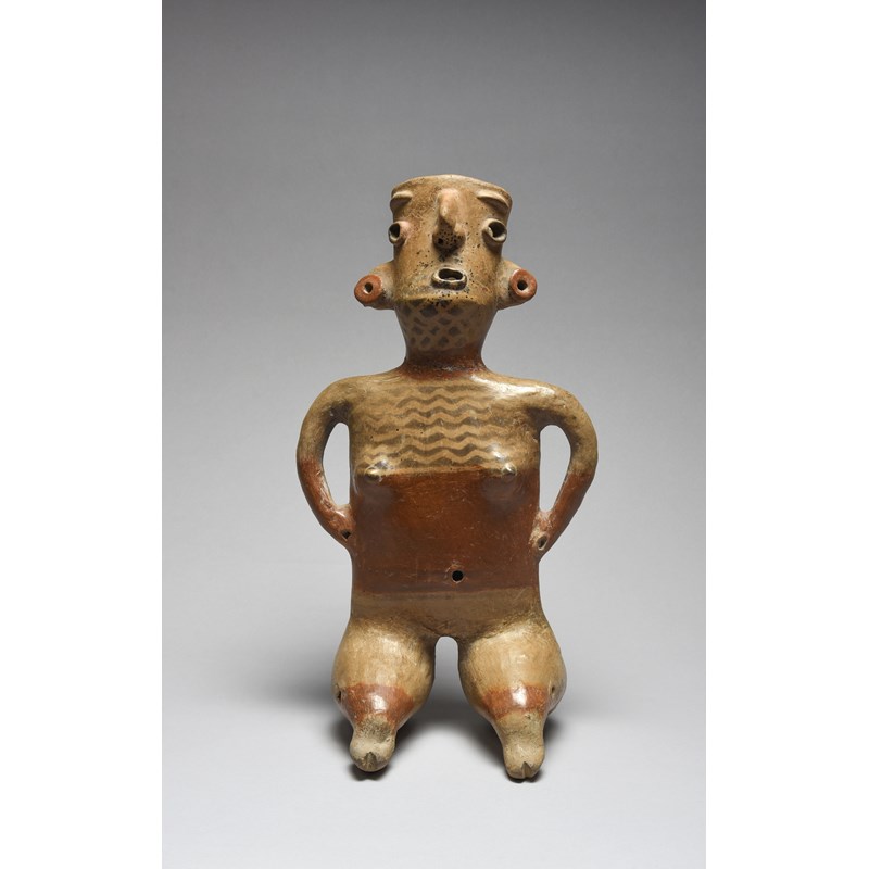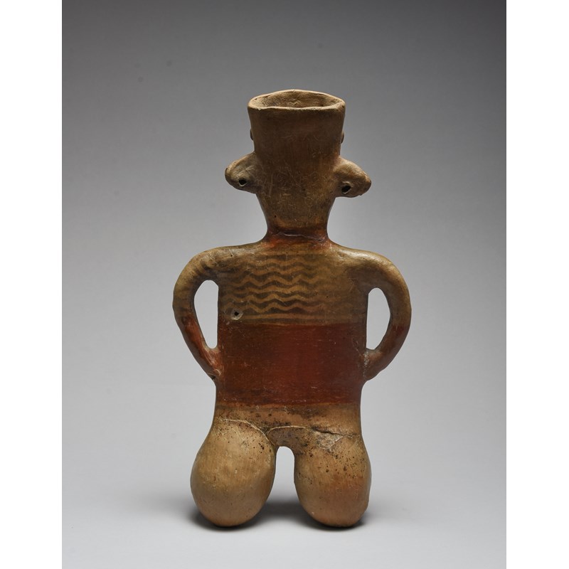hollow pottery, with pierced eyes, mouth and ear spools, with painted and resist decoration,