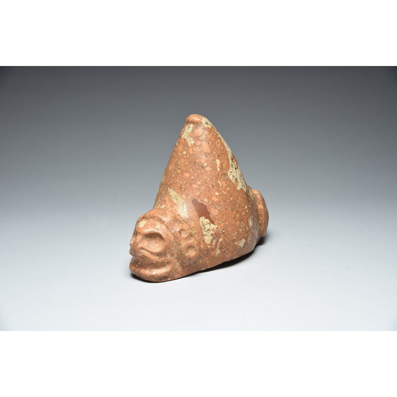 red and white mottled stone, carved a crouching zemi figure with recessed eyes, wide open mouth, headband and bent legs, the swollen central point with a curved tip, the underside concave,