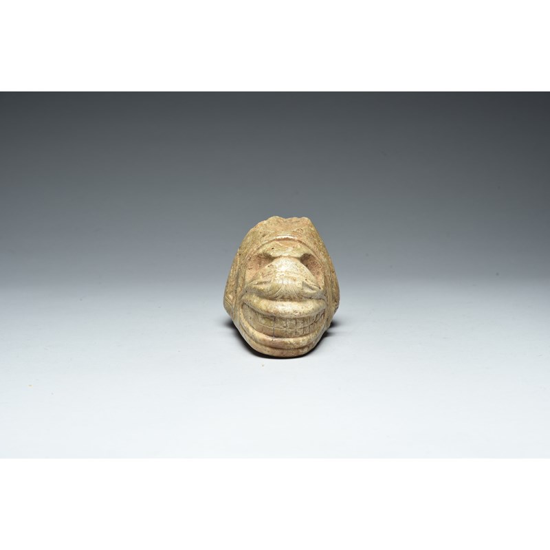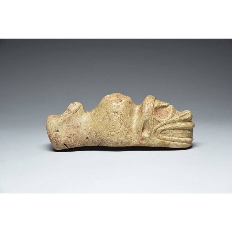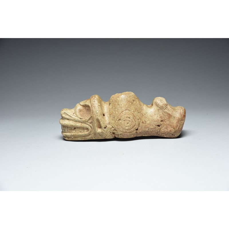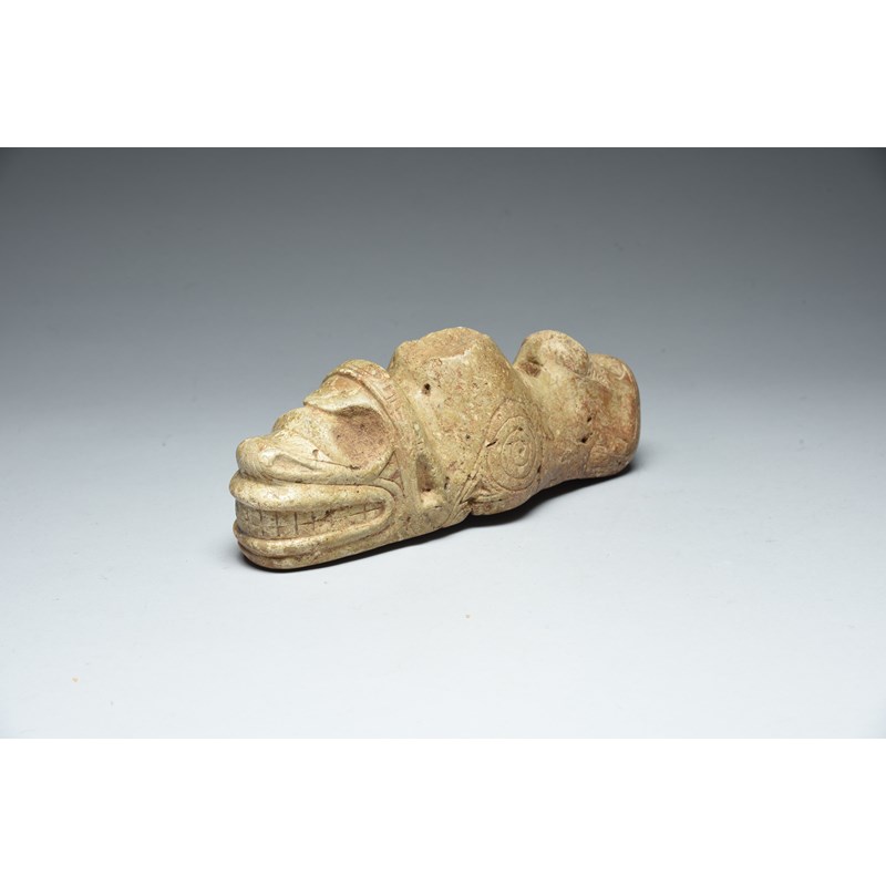 stone, with a carved zemi head to the front with deep recessed eyes and a wide open mouth with teeth, the centre point missing and with incised spiral decoration, the back with incised legs, with a concave underside,