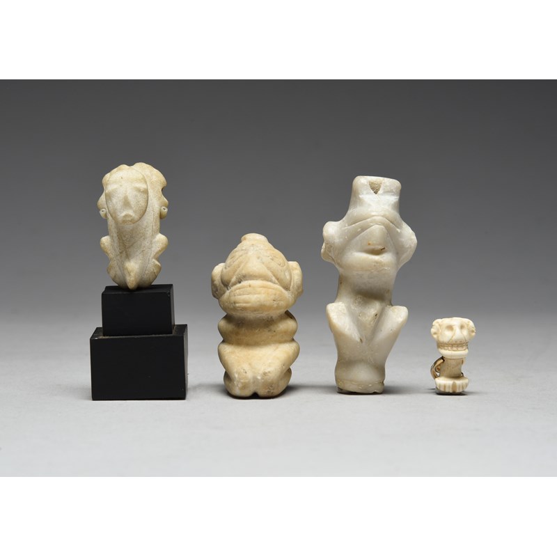 and three Taino figural amulets Caribbean, circa 1000 - 1500 AD, two stone, one kneeling with clenched teeth and horizontal tear drop shape eyes, drilled through the neck for attachment, 4.3cm high, another a crouching figure, drilled through the ears for attachment, 6cm high and the third shell, carved as a head with clenched teeth, recessed eye sockets and headband, with a long body and feet, the side drilled and with ring attachments, 2.1cm high. (5)