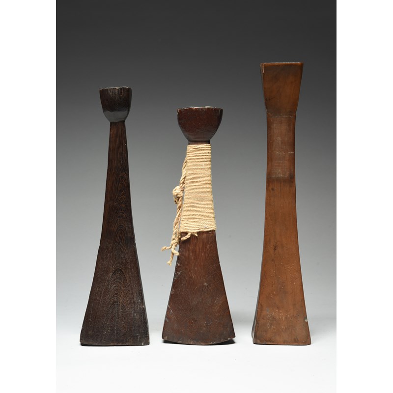 and two smaller Guyana macana clubs, one with a string bound grip, 30cm and the other with a cut notch to each adge of the main body, 32.6cm long. (3)