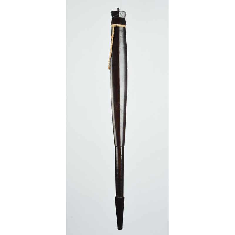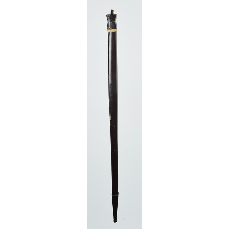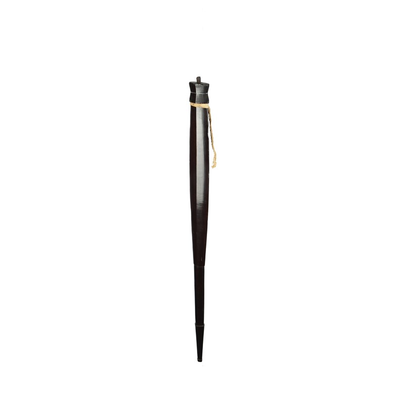 the tapered blade of lozenge form with a waisted block top and finial, with tied fibre, to an elliptical handle and tapered facet terminal,
