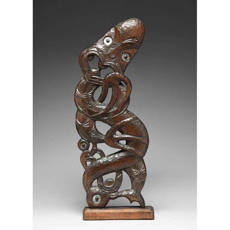 representing the Whanganui River, with inset haliotis shell eyes, the back incised Te Haka by Ropata,