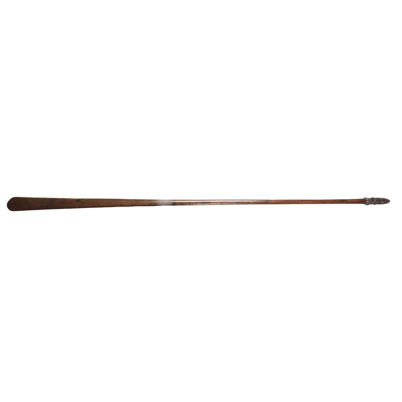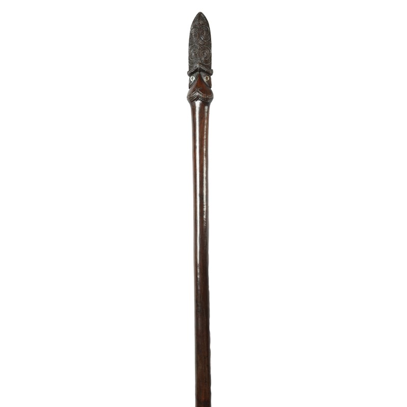 of spatulate form with a carved janiform tiki head terminal with inset haliotis shell eyes,