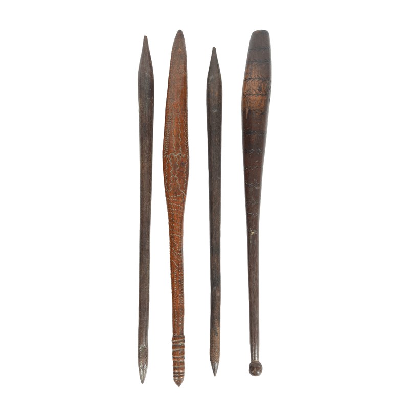 two Aboriginal digging sticks, with channelled decoration and with textured cut terminals, 68cm and 71.5cm long and an Aboriginal club, with bands of scorched track decoration, with a knopped terminal, 70cm long. (4)