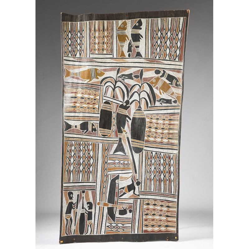 Dreamtime - depicting the fishermen, Borag and Wugarmadji, with paddle and harpoon, and in their canoe spearing a dugong; the canoe then turns into a rock and the dugong feeds off seaweed and other fish swim nearby,