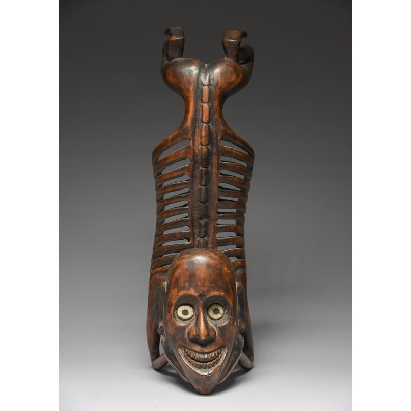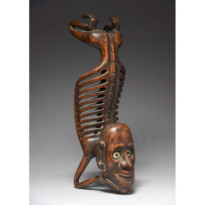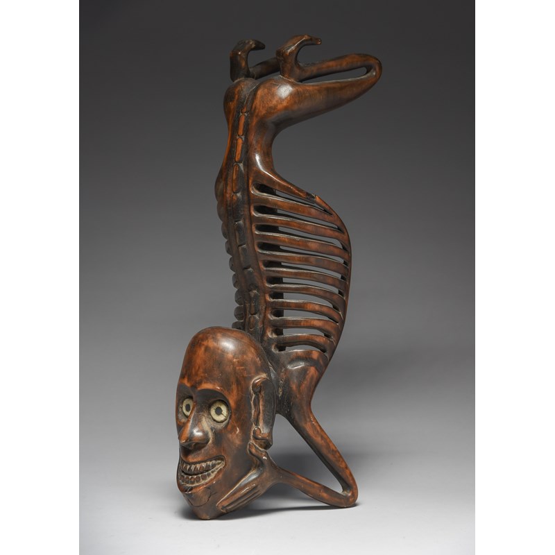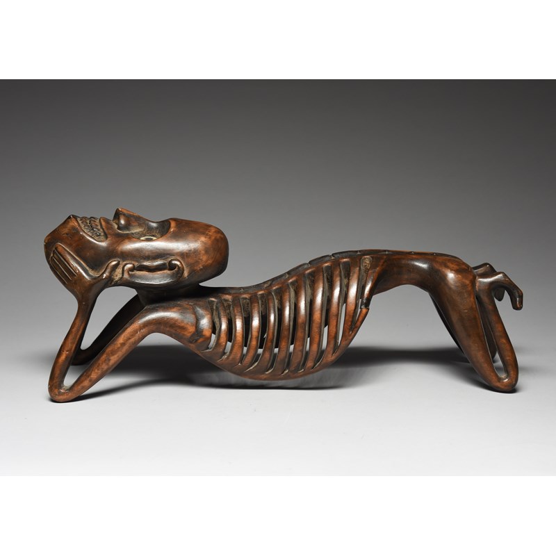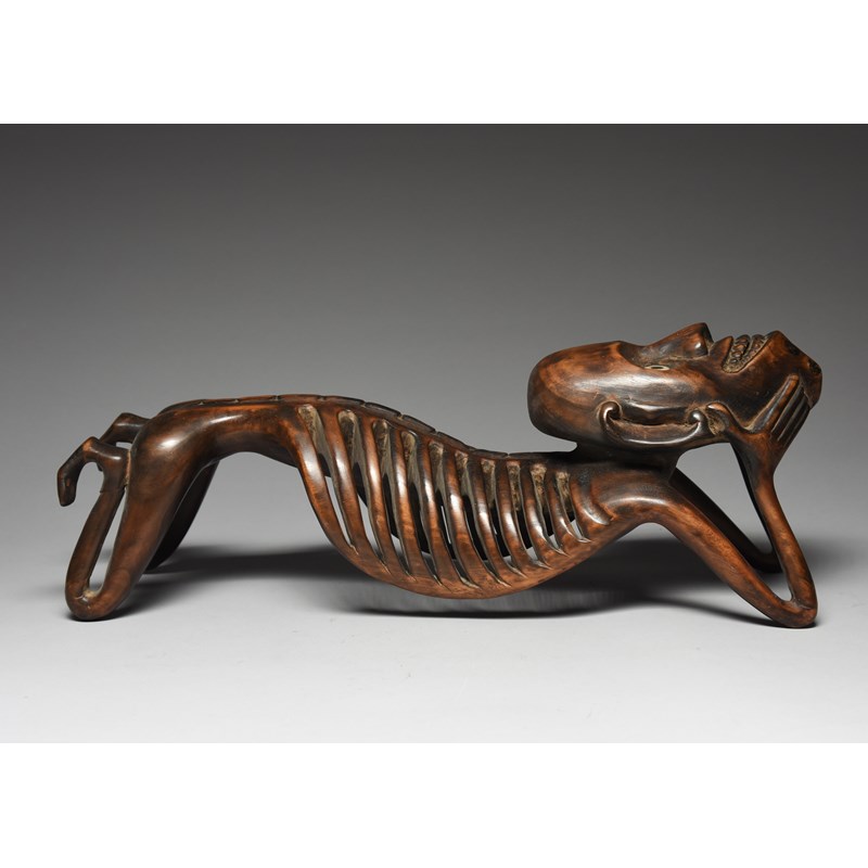 with his body upside down supported on his elbows and with his head in his hands, with a wide grin and with shell and ebonised eyes,