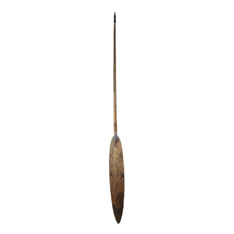 the blade with painted decoration and a carved mask, a part medial ridge to the back and carved bands above, the tapered shaft with a carved ancestor figure terminal,