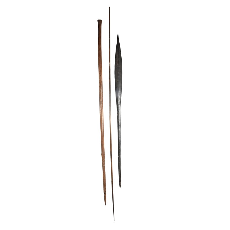 an Oceanic barbed spear, 181cm long and a Papua New Guinea palmwood paddle/spear, with two attachment holes to the end, 148cm long. (3)