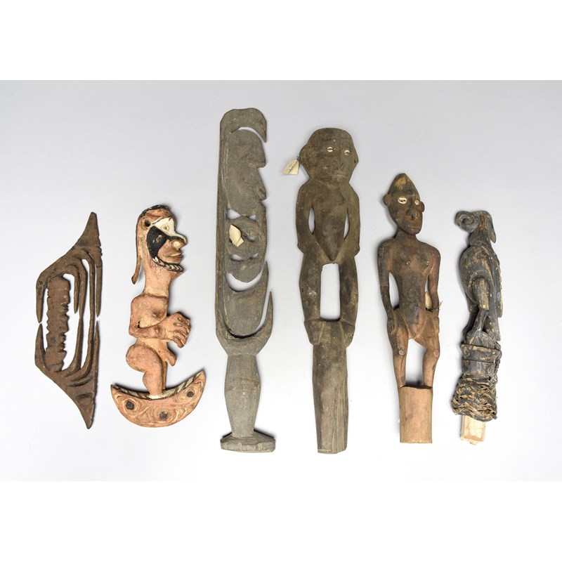 and five Papua New Guinea carvings, including a hook figure, a male figure, a bird and two hunting charms. (6)