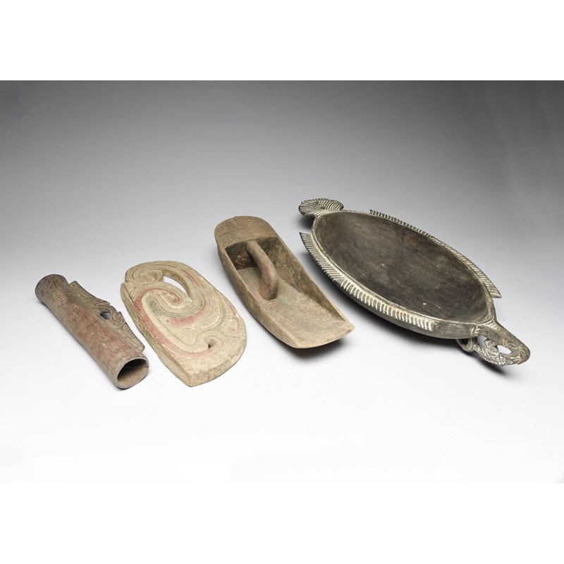 a Massim canoe prow fragment, 36cm long, a Massim bailer, 36.5cm long, and a Massim drum, 29.5cm long. (4)