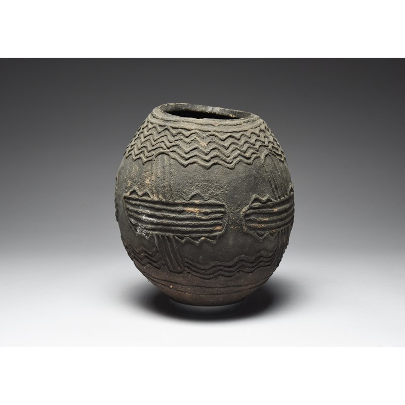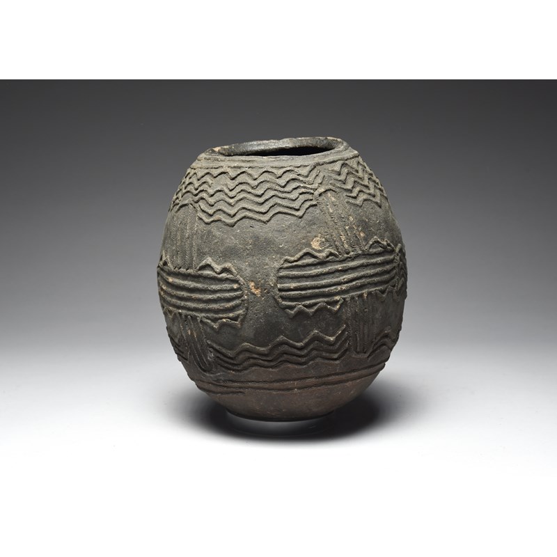 pottery, of ovoid form with raised linear decoration of zig-zags and crosses, the base with collection number A19 and inscribed Collingwood Bay ...,