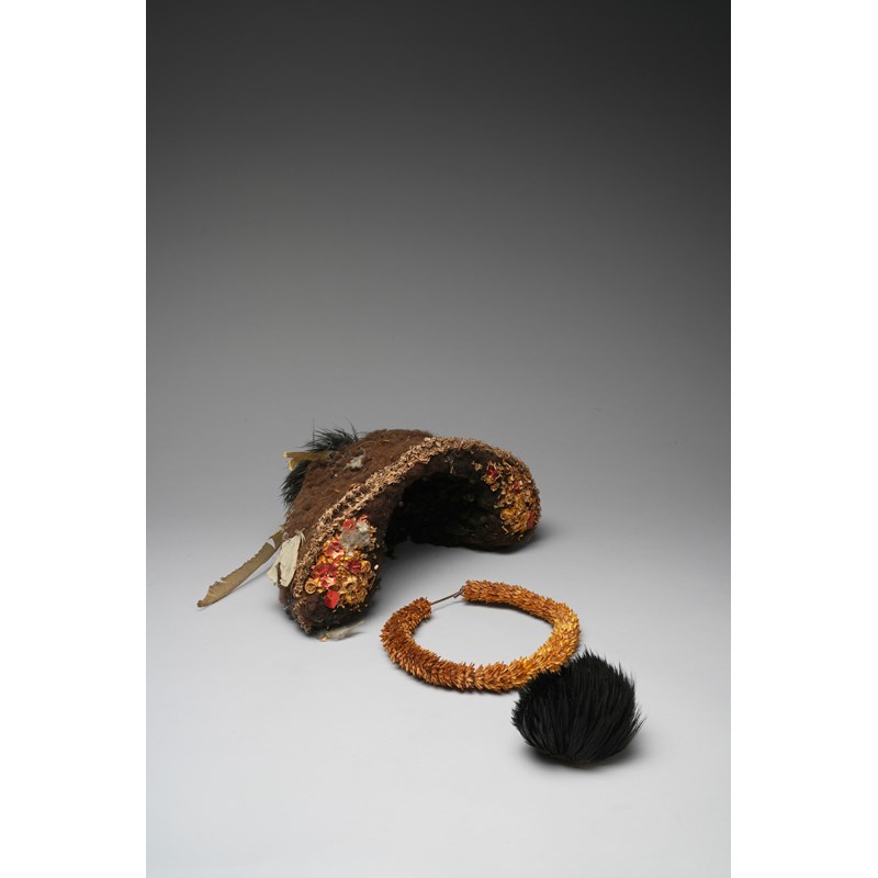 an everlasting daisy necklace, 21cm long, and fibre mounted cassowary feather boss, 10cm high. (3)