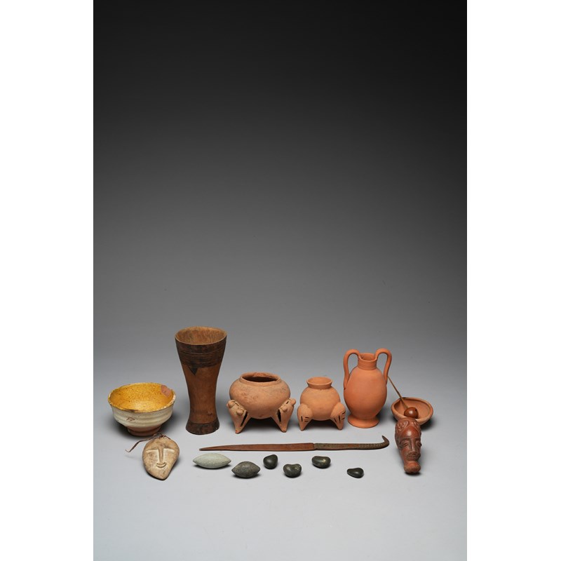 four pottery vessels and an oil lamp, an African vessel, with scorched decoration, a stone mask amulet, a spindle, a West African copper knife and six slingshot stones. (16)