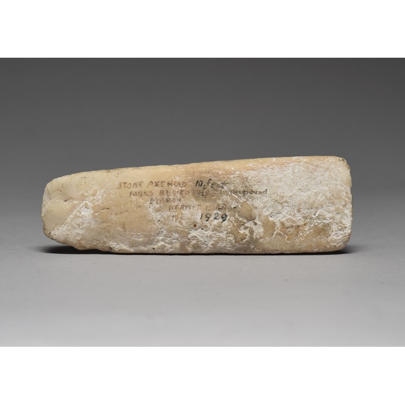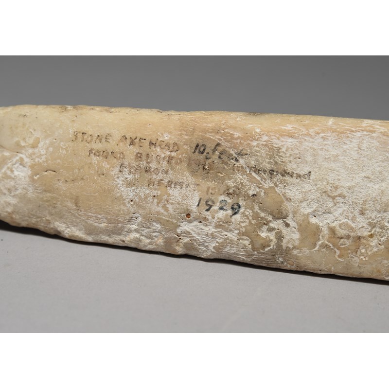 clam shell, inscribed STONE AXE HEAD FOUND BURIED 10 feet... MARON HERMIT ISLANDS 1929,