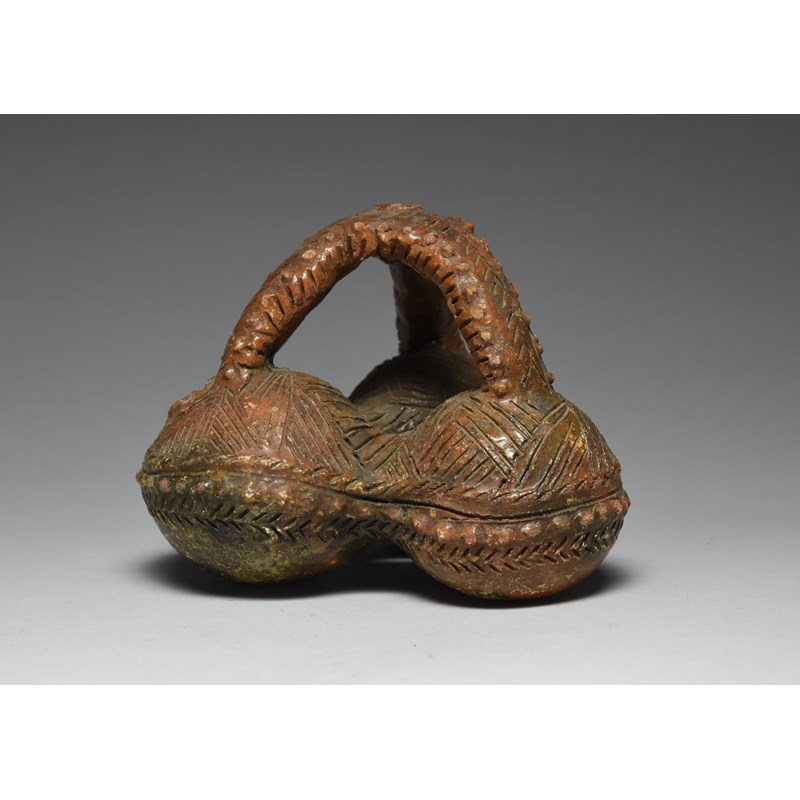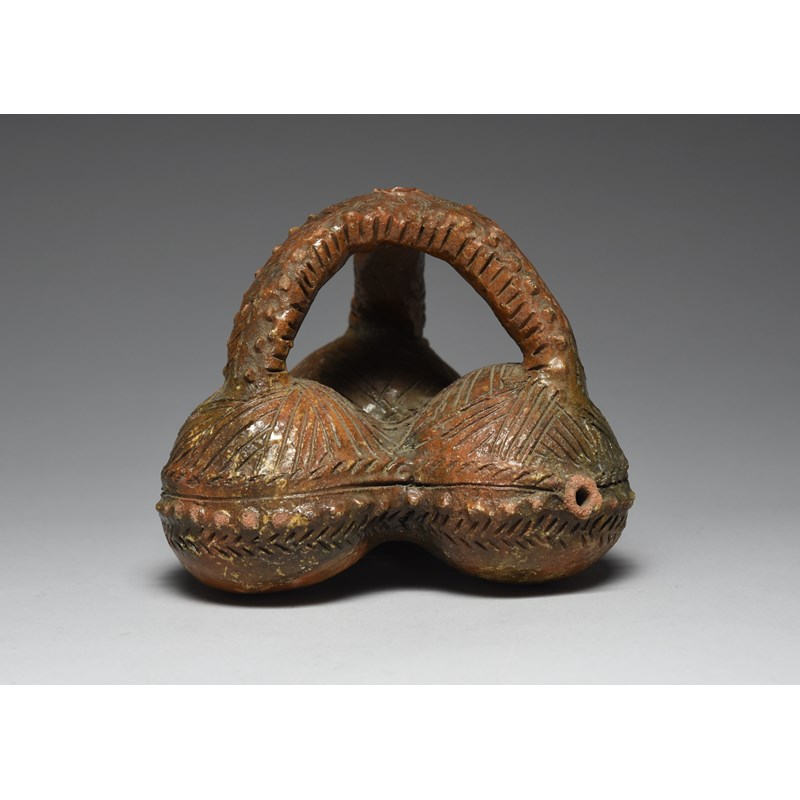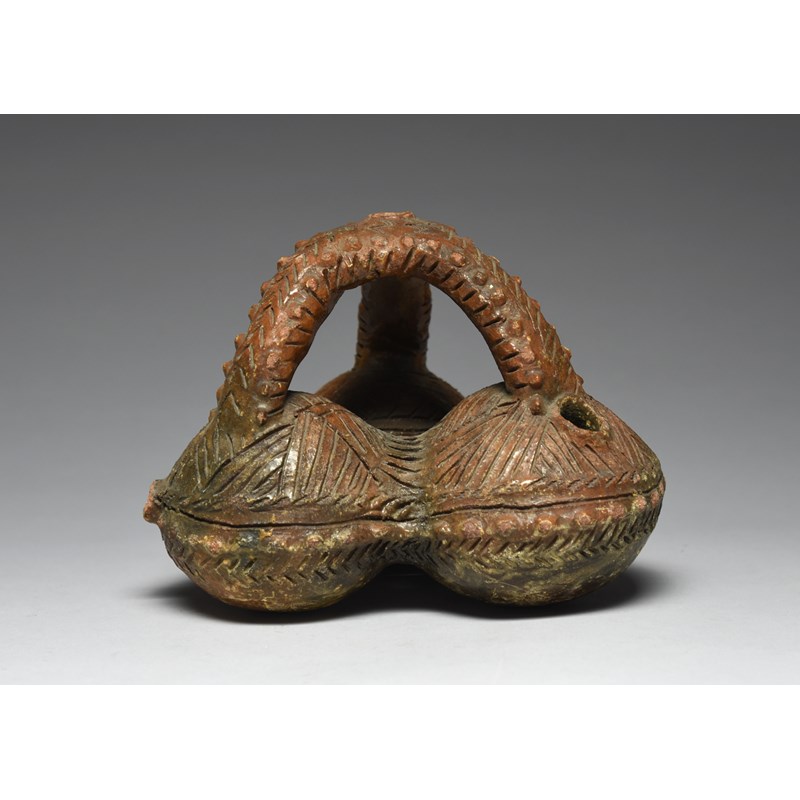 earthenware, with three linked chambers, one with a filling hole and another with a spout, with an arching handle, having a central hole for suspension, the whole with raised beads and incised linear decoration,