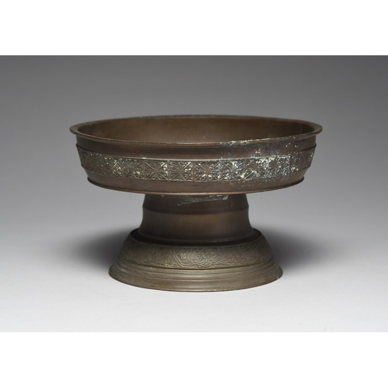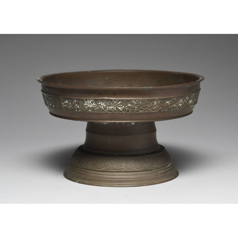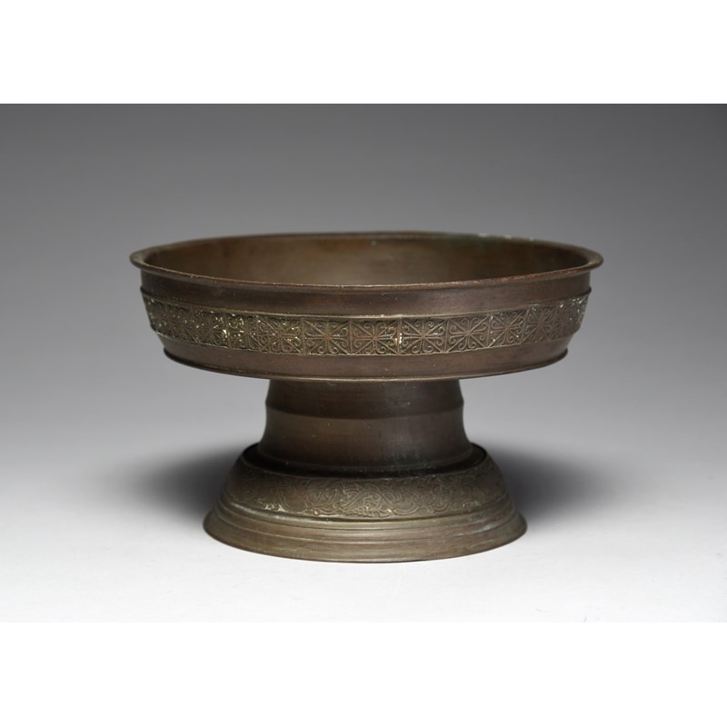 coppered brass on a stem and spreading foot, with cast geometric and fruiting vine bands, with white collection number A36,