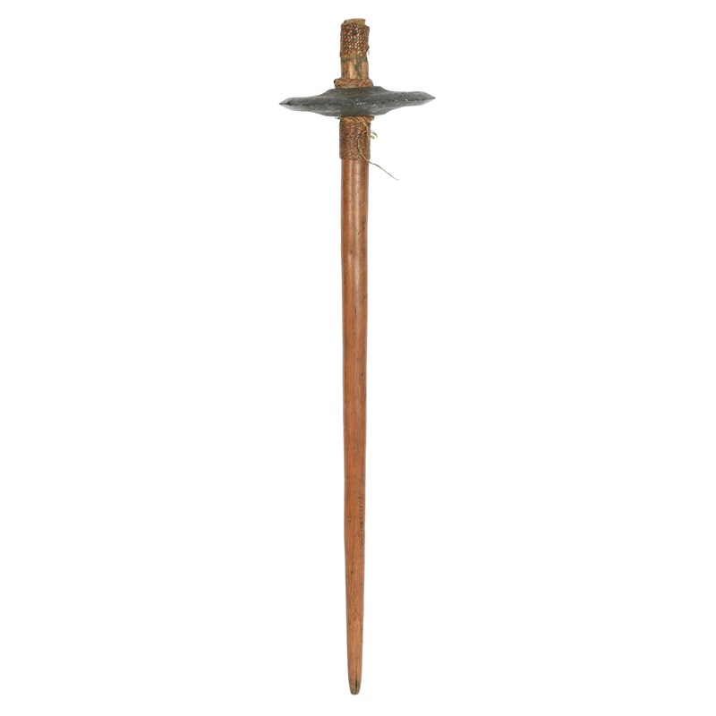 with a stone disc head having a channelled band either side, on a wood shaft with woven fibre mounts, with collection numbers on the shaft, A22a, and on the blade A22b,