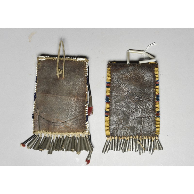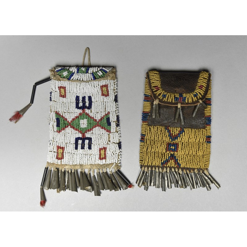 buckskin and leather with coloured glass beads and tin cones, with geometric designs to the fronts, the Ute inscribed to the back OCT 1, 1948 RIELICH,