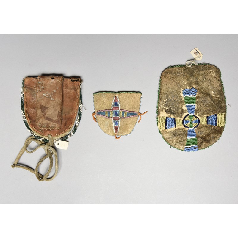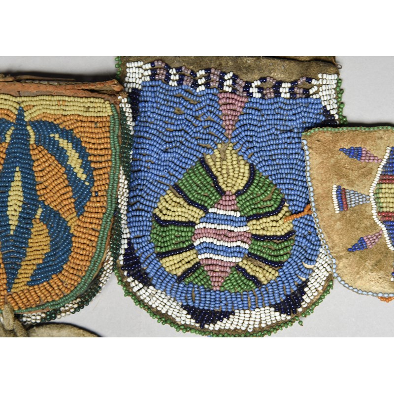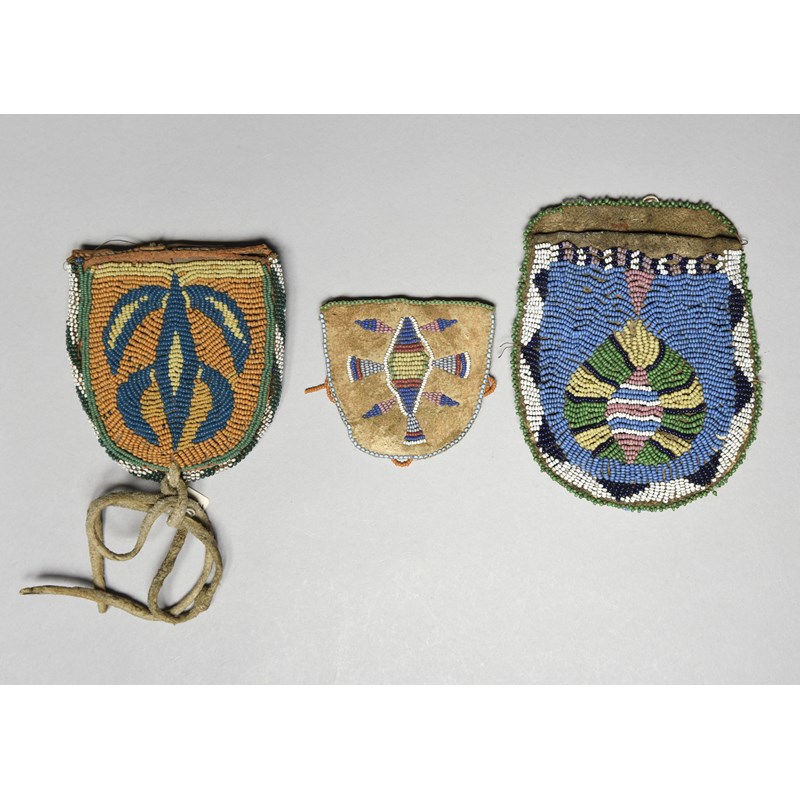 buckskin, leather and coloured glass beads, including an Ute ration ticket pouch,13.5cm high, a Kiowa pouch with a belt loop to the back, 11cm high and a Crow watch pouch, 7cm high. (3)