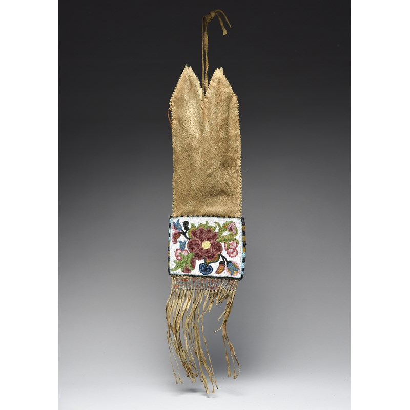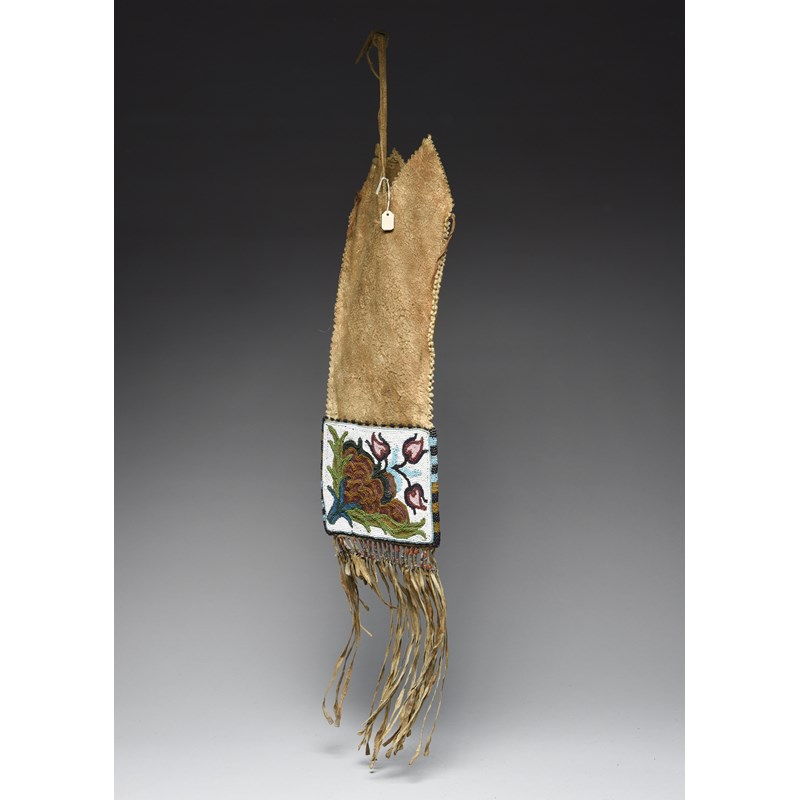 buckskin with cut edges and floral coloured glass bead panels, the tassels with dyed quill and blue glass beads,