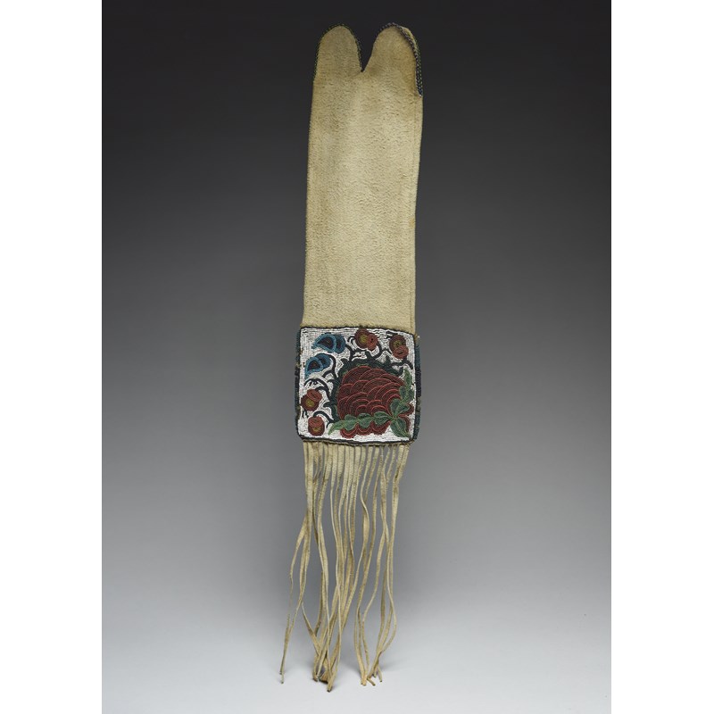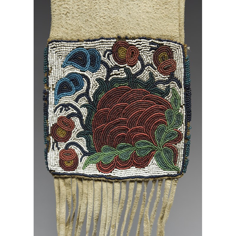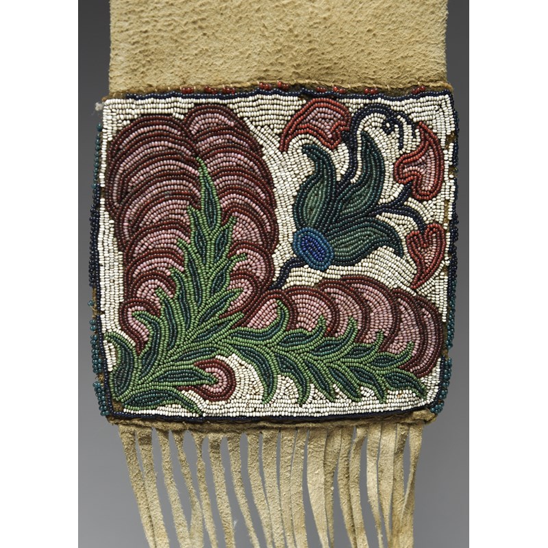 buckskin and coloured glass beads with differing floral panels and edging to the four tongued top, the base with tassels,