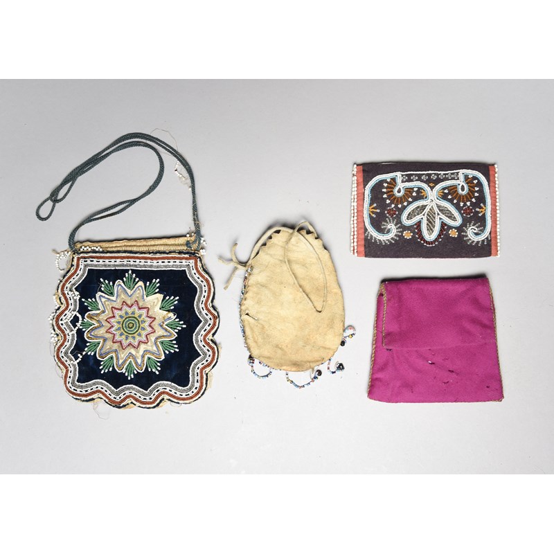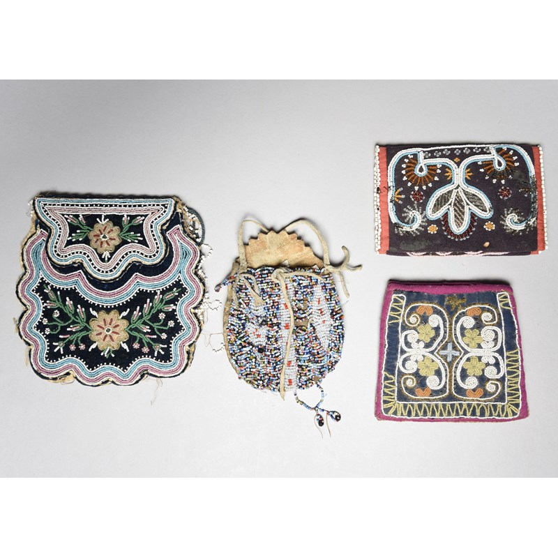 a Maliseet beaded pouch, 10.5cm high, an Ute/Apache beaded pouch, 12.5cm high, and an Iroquois beaded bag, 14.5cm high. (4)