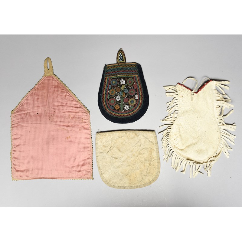 a Subarctic wall pocket, tanned hide and glass beads, 35cm high, a Maliseet bag, velvet with glass and metal beads, 17cm high, and a North American buckskin and beaded pouch, 27cm high. (4)