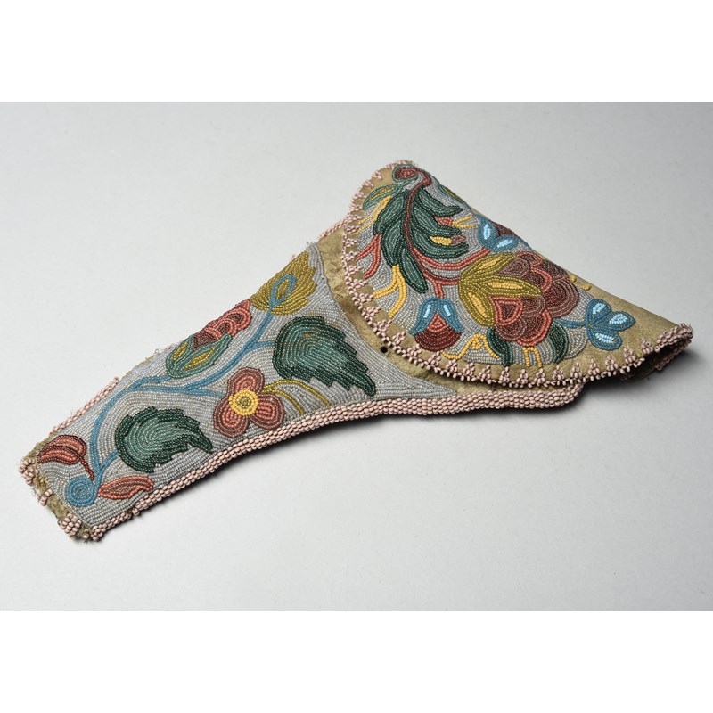 buckskin with coloured glass beads of floral designs to the front and flap, the back with a belt loop,