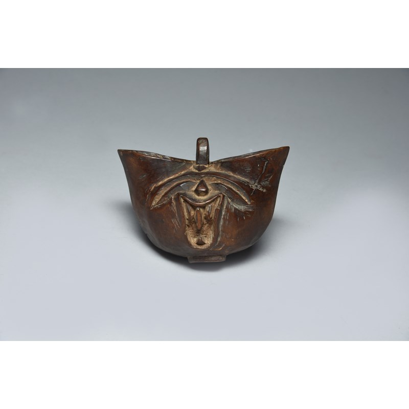 double spouted with a carved open mouthed face to one side and a central lug handle to the top,